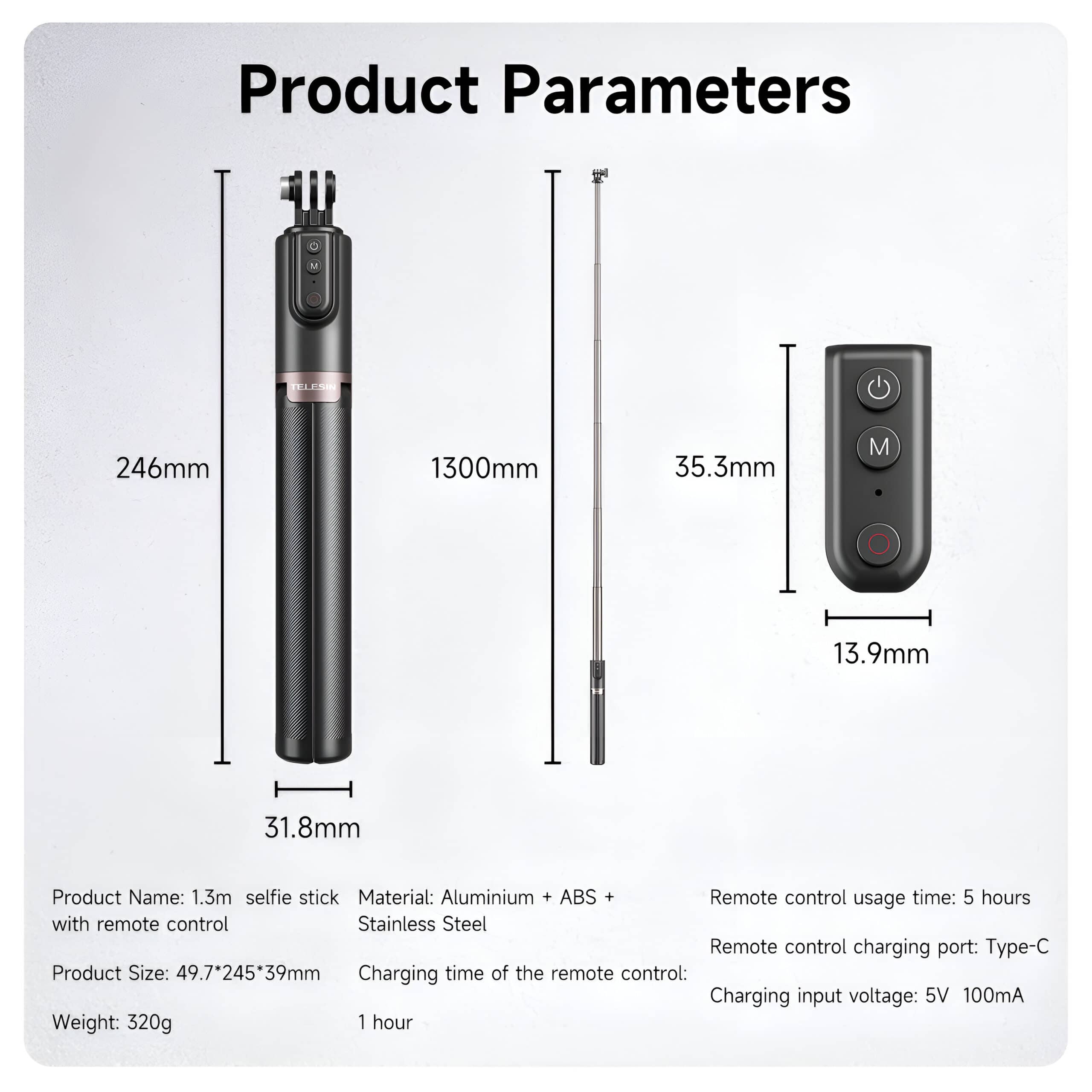 The 1.3M Extendable Selfie Stick Tripod is packed with innovative features to make shooting effortless and fun. From a sturdy aluminum build to a wireless Bluetooth remote control, every detail has been carefully crafted to offer ultimate convenience and reliability. Its adjustable design allows you to capture shots from unique perspectives, and the ability to switch between horizontal and vertical modes ensures every frame fits your creative vision.