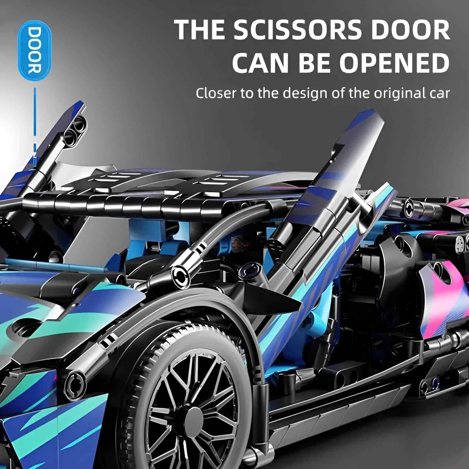 - Authentic Details: Equipped with a front hood, openable scissor doors, a mechanical roof, simulated engine, blue seats, and a streamlined tail – all inspired by real supercar elements.