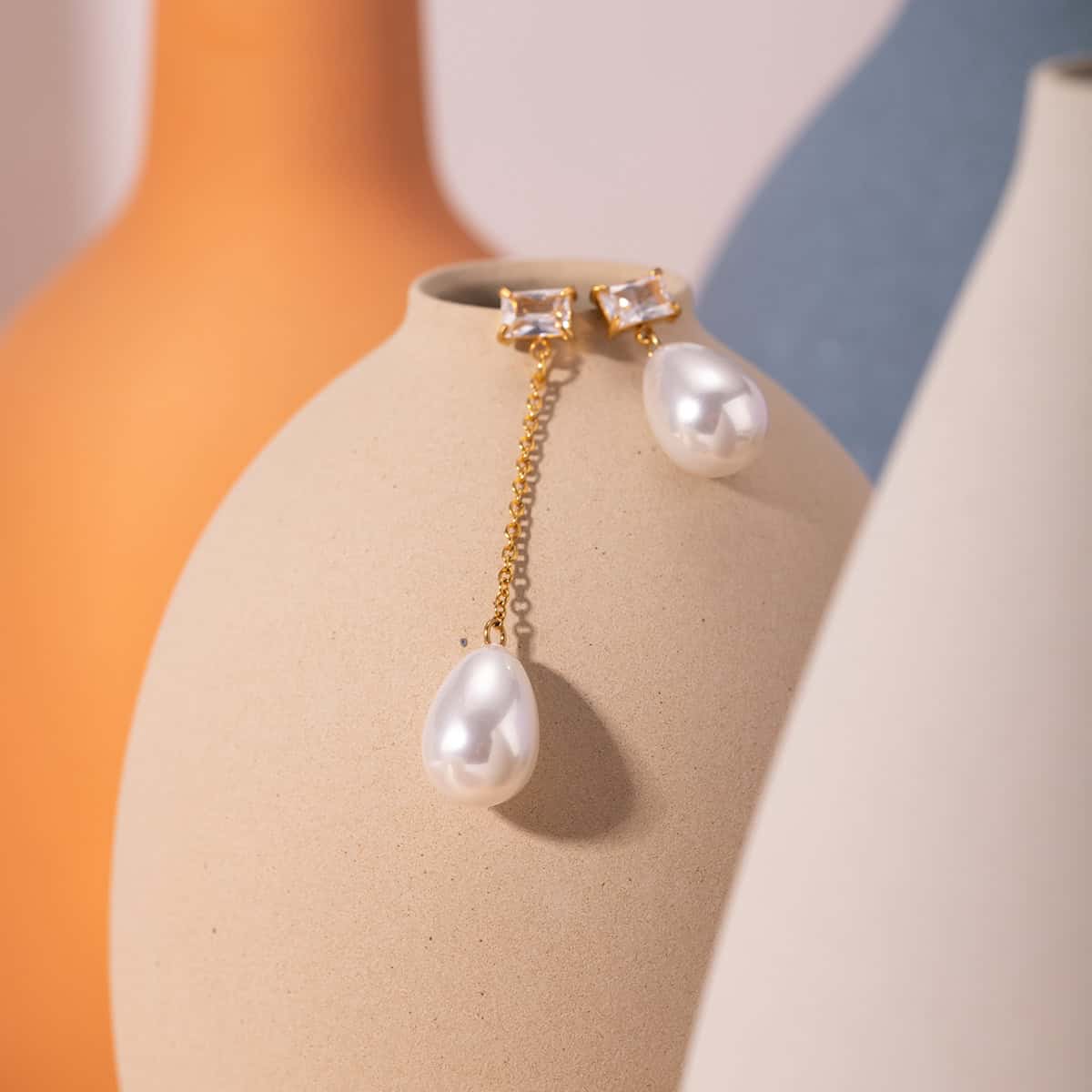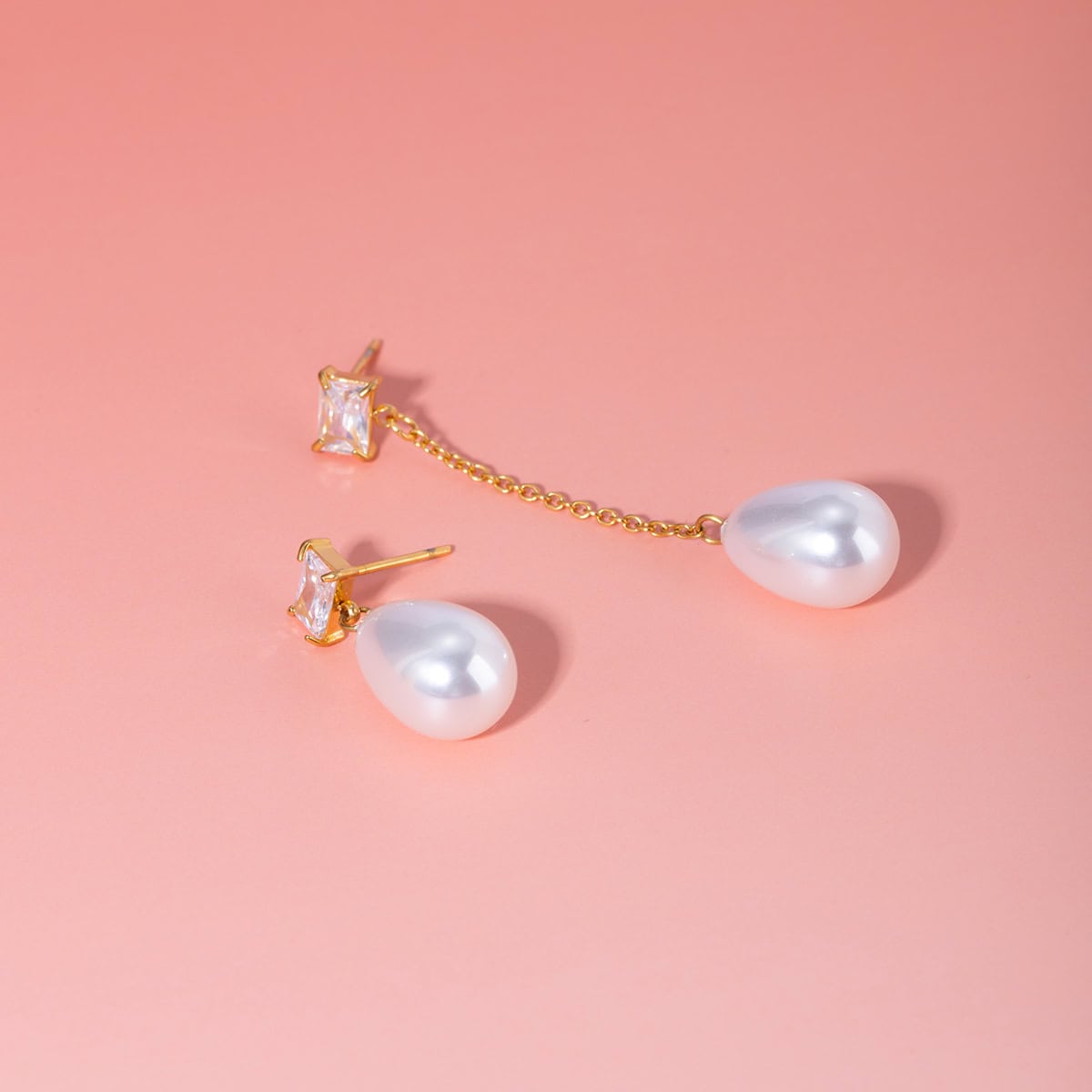 Elevate your style with our exquisite 18K PVD Stainless Steel Light Luxury Rectangular Zircon Drop Shaped Asymmetrical Pendant Pearl Earrings. Crafted with precision and passion, these earrings are a true statement of luxury and sophistication.