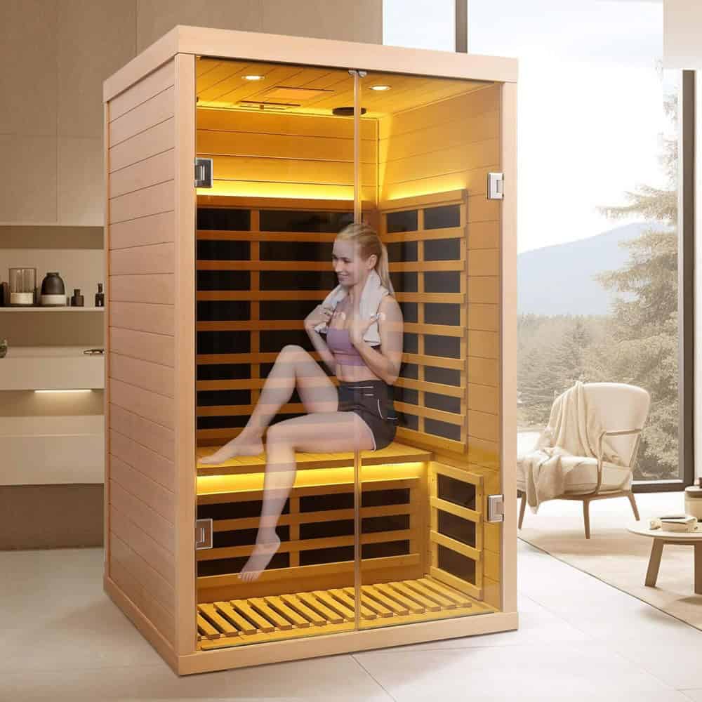 This sauna isn’t just a luxury addition to your home, it’s an investment in your health. The natural wood construction provides a calming, serene environment, while the low EMF heating ensures a safe and relaxing experience. The quick warm-up feature means you can enjoy the benefits of a sauna even if you’re short on time. Plus, with the added Bluetooth speakers and LED chromotherapy lights, your sauna experience becomes a sensory retreat that rejuvenates both your body and mind.