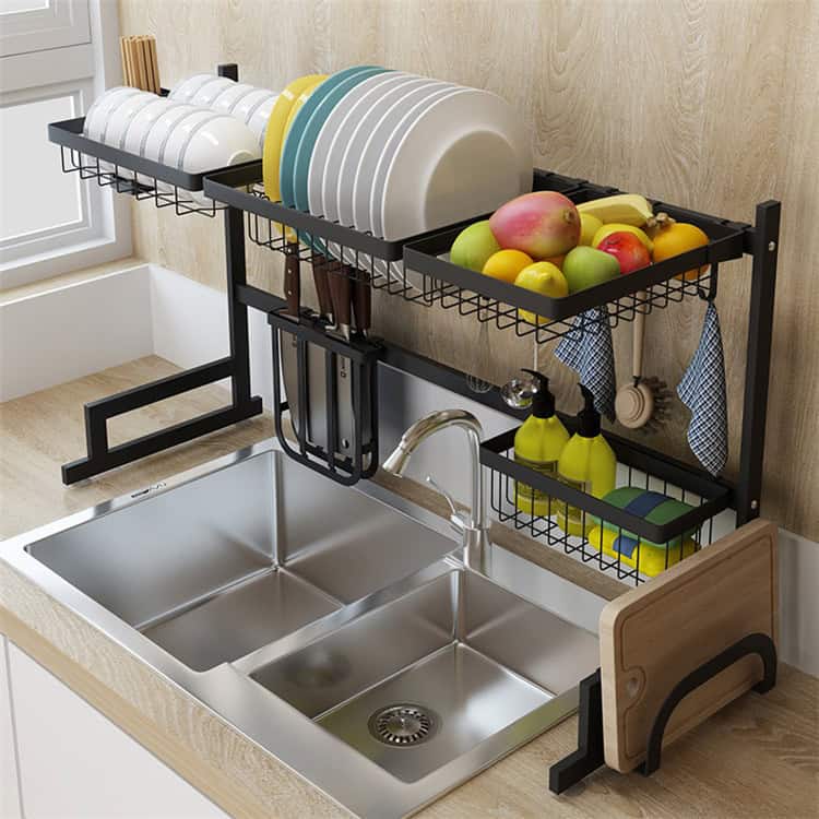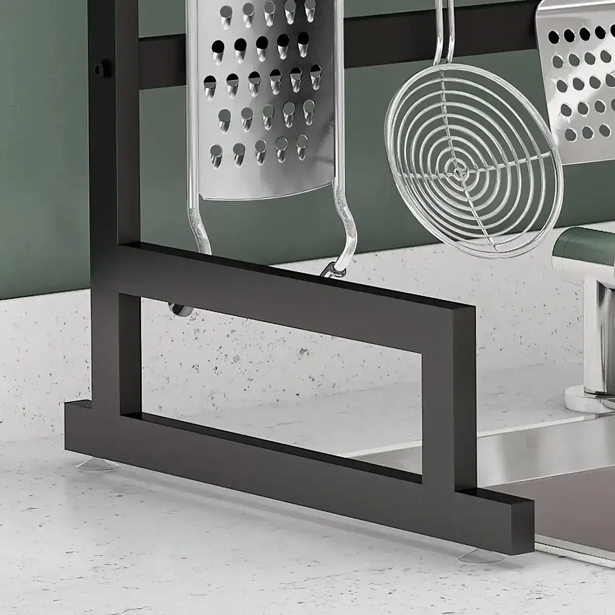 A stylish and functional black metal dish drying rack with sections for plates, utensils, fruits, and cleaning supplies, placed above a stainless steel sink for efficient drying and kitchen organization.