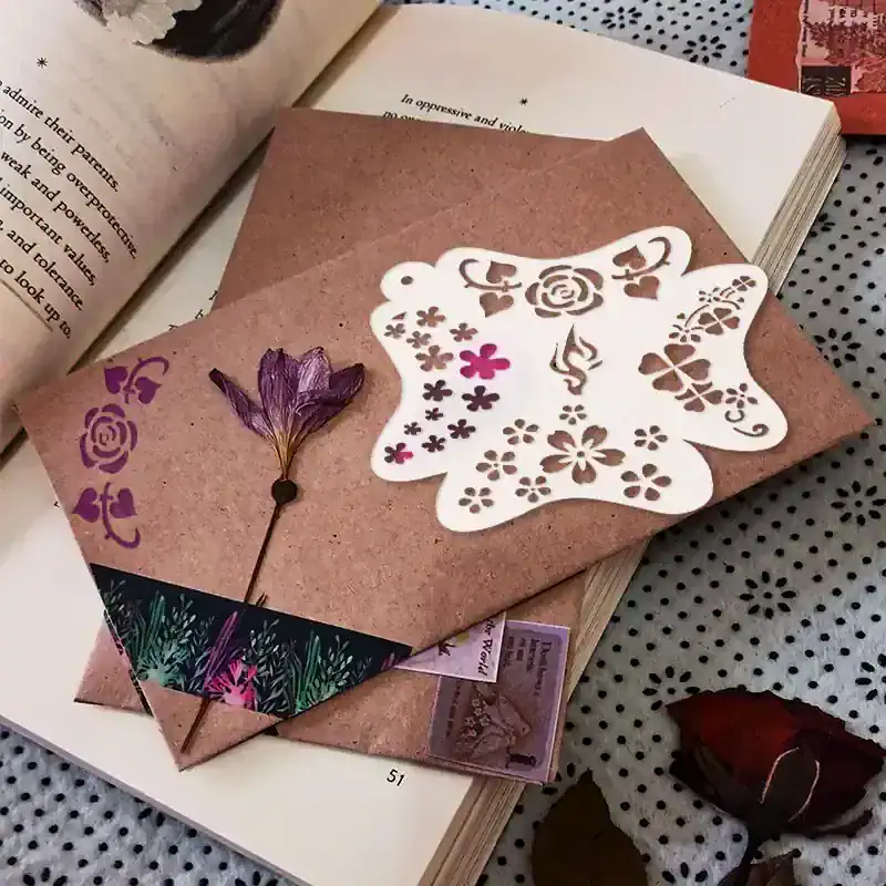 Elegant butterfly-themed floral cutout paper craft on a textured pink envelope with dried flower accents, perfect for personalized stationery or decorative art.