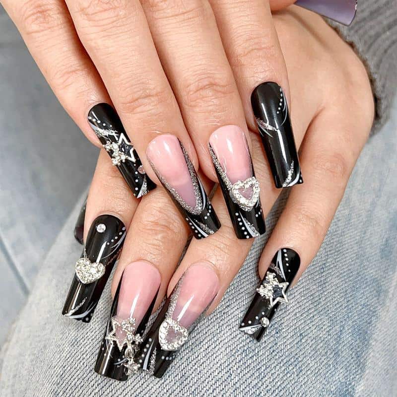 Elegant black and silver nail art with rhinestone embellishments and 3D heart-shaped accents, perfect for stylish occasions.