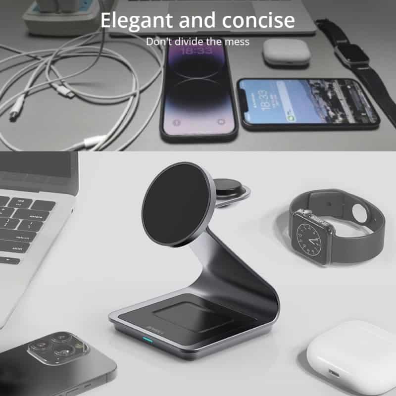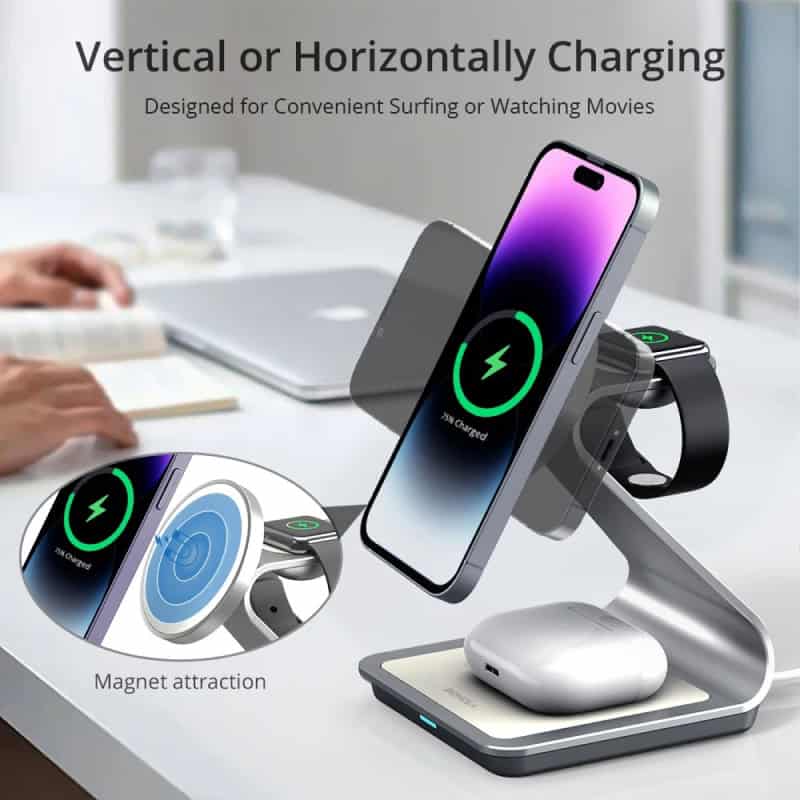 This magnetic 3-in-1 wireless charging station is not only convenient but also incredibly efficient. Whether you’re charging your iPhone, Apple Watch, or AirPods, you can trust that each device will get the optimal power it needs. The fast charging feature, combined with the magnetic alignment, ensures that your devices are charged quickly and securely. Plus, its sleek aluminum alloy design adds a modern touch to your workspace or nightstand.