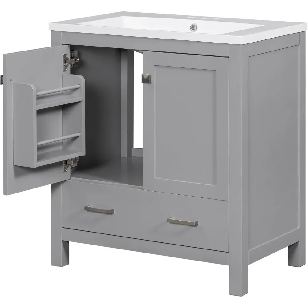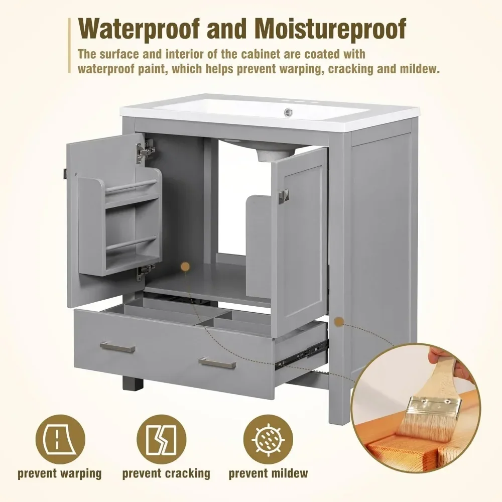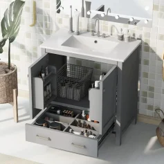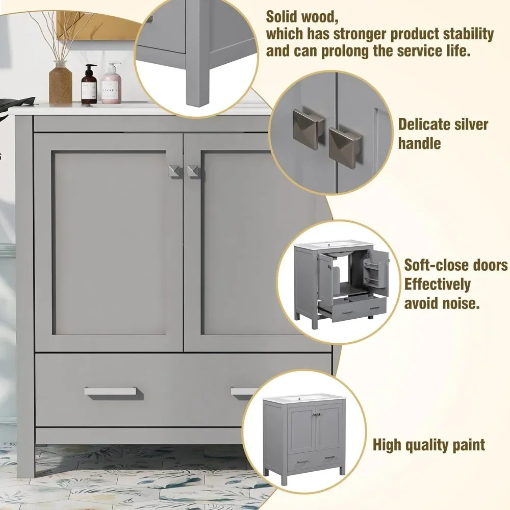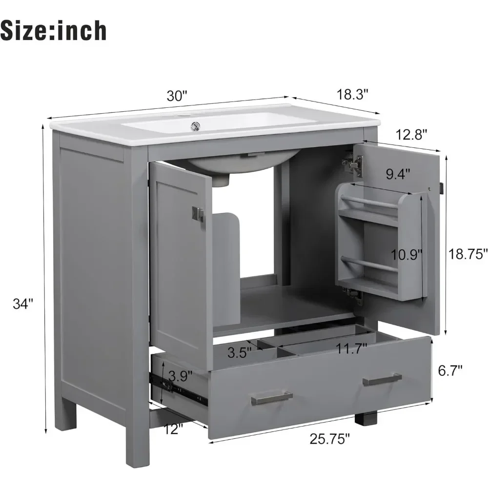 Redefine your bathroom with this stunning 30-inch bathroom vanity sink cabinet. Designed for functionality and style, this vanity features a sleek ceramic basin, a two-door cabinet, and drawers for optimal storage. Its compact yet spacious design makes it perfect for any bathroom, from cozy guest spaces to master suites. Crafted with durable acrylic, it adds a polished look to your space while offering a practical solution for your storage needs.