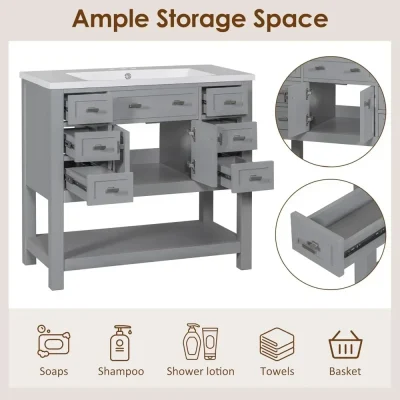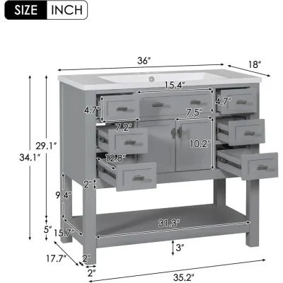 Transform your bathroom into a haven of sophistication with our 36-inch grey bathroom vanity. This sleek and modern piece features a solid wood frame, a durable ceramic sink, and a minimalist design that blends timeless elegance with contemporary charm. The freestanding vanity is crafted to suit various bathroom aesthetics, offering clean lines and a mix of premium materials that make it the centerpiece of any space.