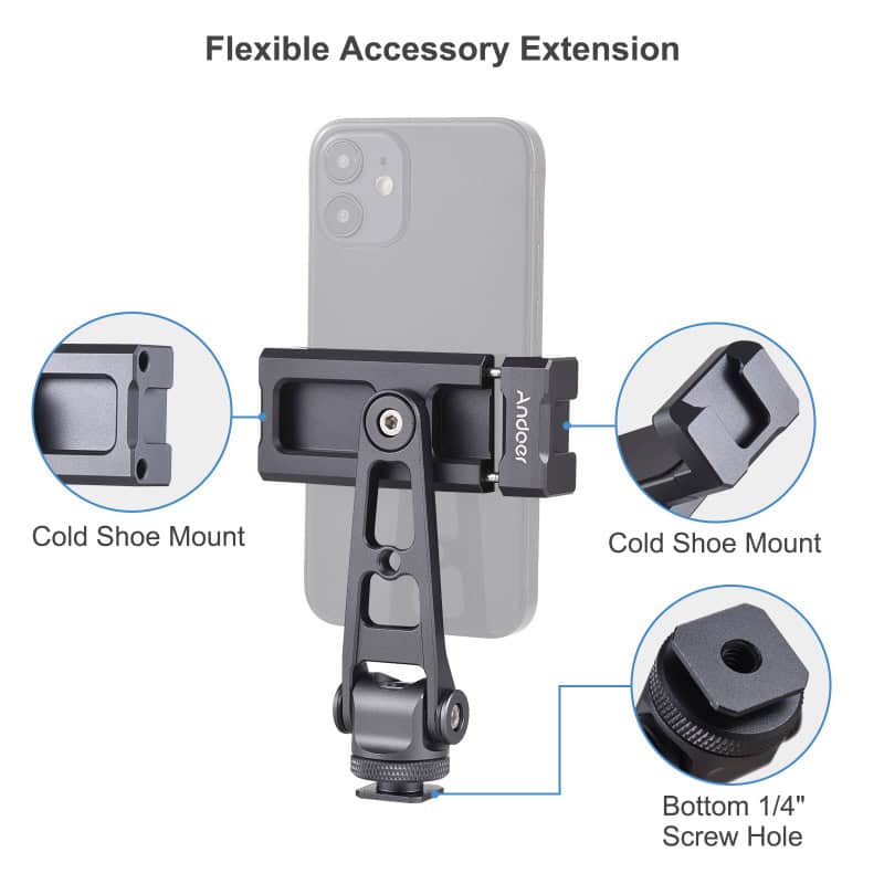 Whether you’re recording videos or snapping selfies, this tripod mount has you covered. Its universal compatibility ensures a snug fit for smartphones with a width range of 2.2 inches to 3.5 inches. The non-slip rubber padding not only prevents scratches but also ensures your phone stays securely in place during use. With dual cold shoe mounts, you can easily attach a microphone and a fill light simultaneously, adding a professional edge to your video quality.