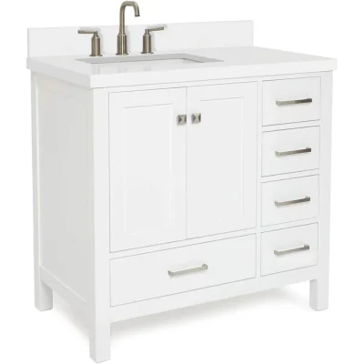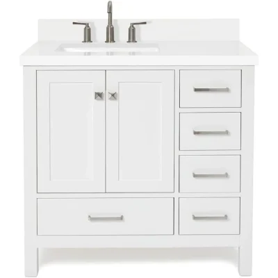 Upgrade your bathroom with this stunning 37-inch white bathroom vanity, designed to blend style, functionality, and durability. Featuring a sleek 1.5-inch edge pure white quartz countertop and a left offset rectangular sink, this vanity adds a modern and luxurious touch to any space. Crafted from premium solid wood and plywood, it’s built to last, resisting moisture and temperature changes without cracking or warping.