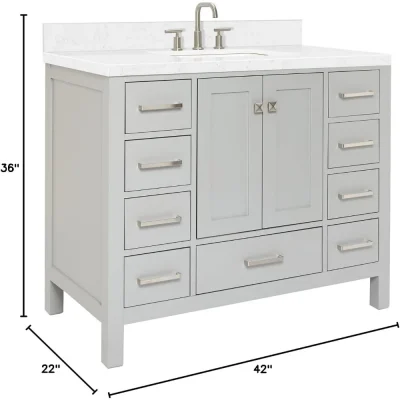 Elevate your bathroom space with this stunning 42″ grey vanity, crafted for style, durability, and convenience. The modern design is accentuated by a premium 1.5-inch edge Carrara white quartz countertop, offering a blend of sophistication and practicality. Whether you’re redesigning your master bath or updating a guest bathroom, this vanity provides the perfect centerpiece.