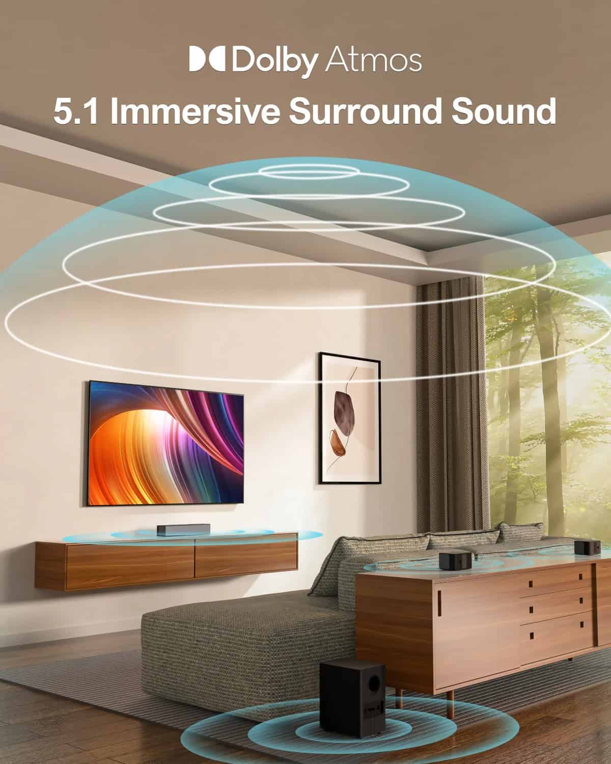 - Room-Filling Sound: True 5.1 channels with a wireless subwoofer for immersive audio.