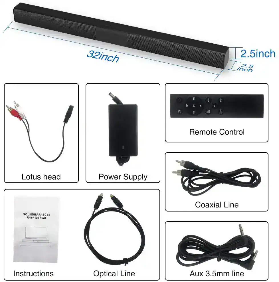 Enhance your entertainment setup with this 50W Bluetooth soundbar featuring a built-in subwoofer and 3D surround sound technology. Designed to fill your room with rich, high-quality audio, this soundbar delivers crystal-clear sound for movies, music, gaming, and more. With both wired and wireless connectivity, it’s the perfect addition to your TV, PC, or home theater system. Compact and sleek, it fits seamlessly into any space while offering powerful sound performance.