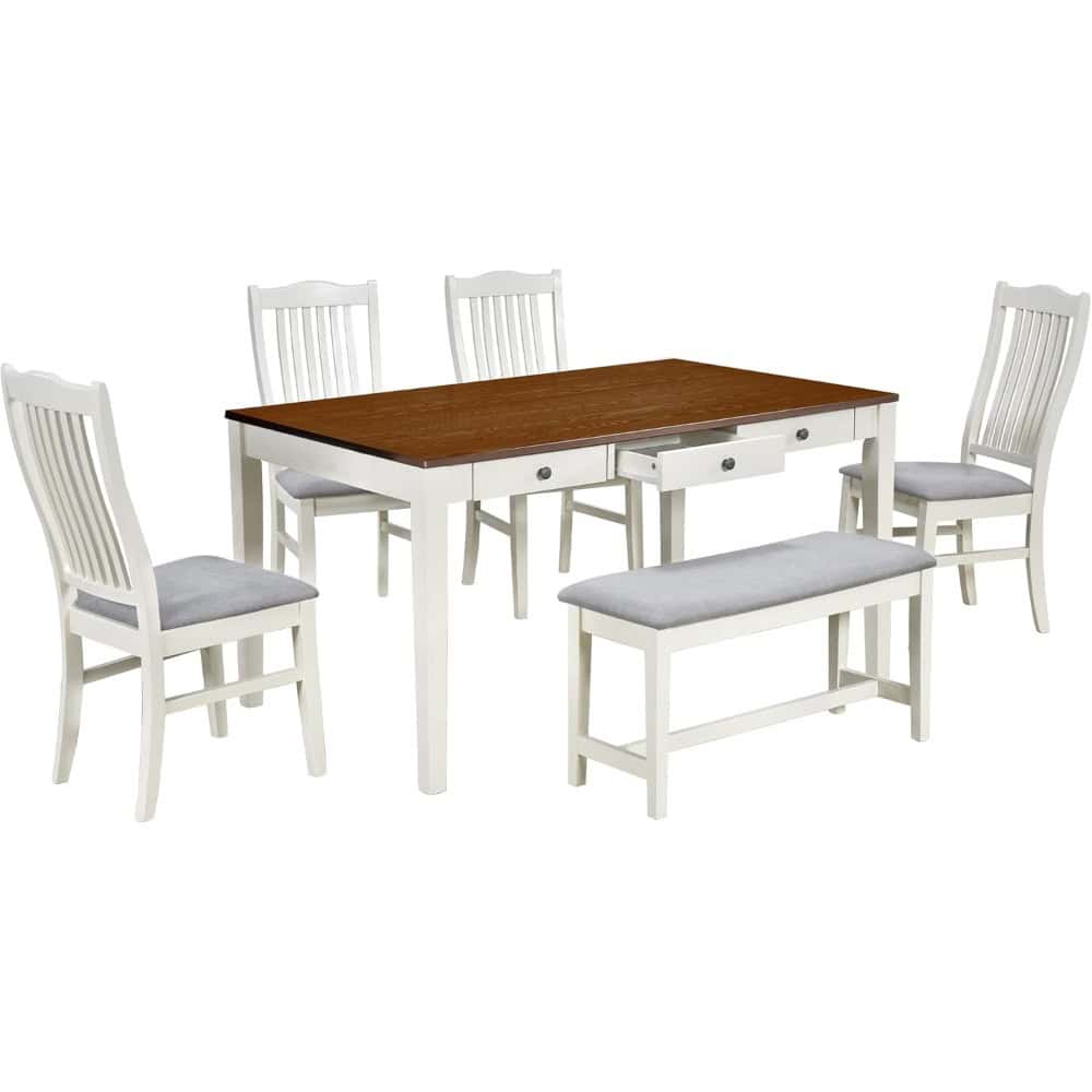 Transform your dining room into a stylish and inviting space with this 6-piece farmhouse dining table set. Featuring a modern design with a classic touch, this set includes a spacious dining table, four upholstered chairs, and a versatile bench. Ideal for family meals or entertaining guests, it combines comfort and elegance with practical functionality, making it the perfect centerpiece for your home.