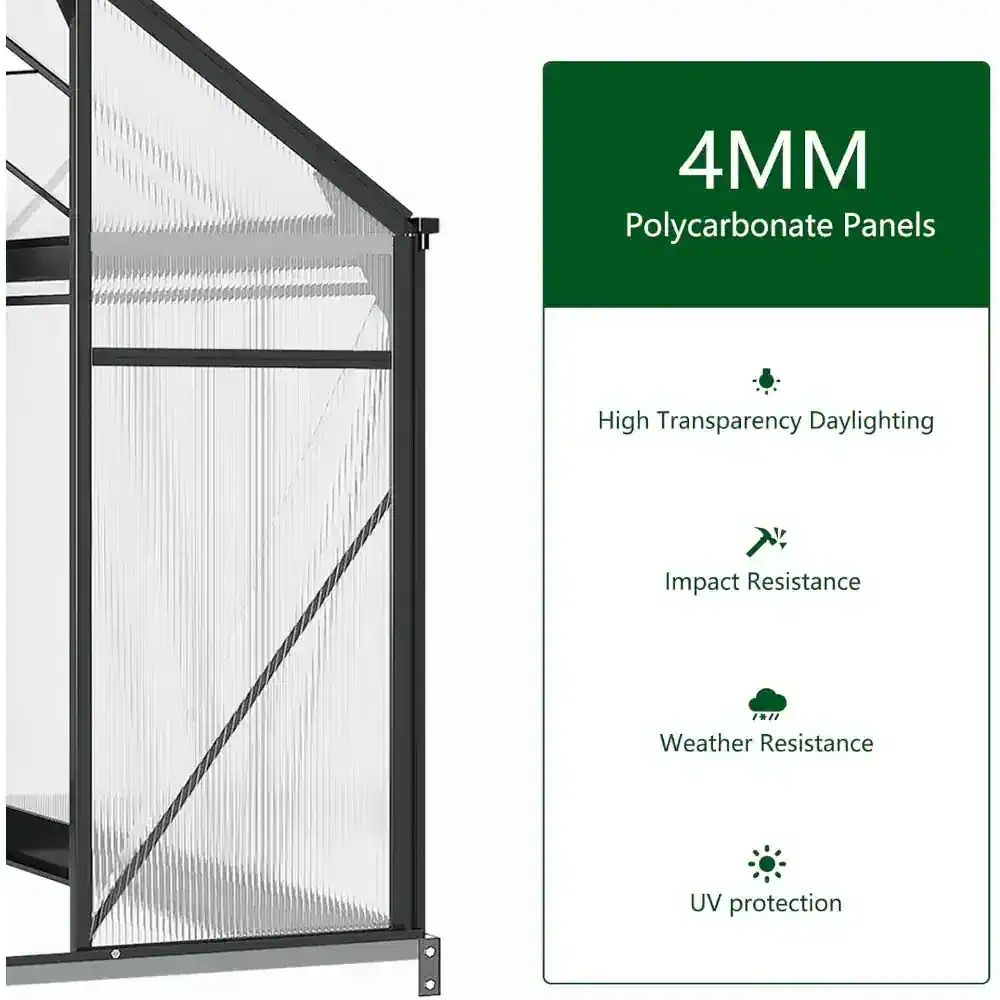 Engineered to withstand the elements, this greenhouse features a high-quality aluminum frame and impact-resistant polycarbonate panels. Its robust construction offers excellent protection against rain, snow, and wind, ensuring your plants stay safe and thrive in any weather. The UV-coated panels allow ample sunlight while shielding your plants from harmful rays, promoting healthy growth in a controlled environment.