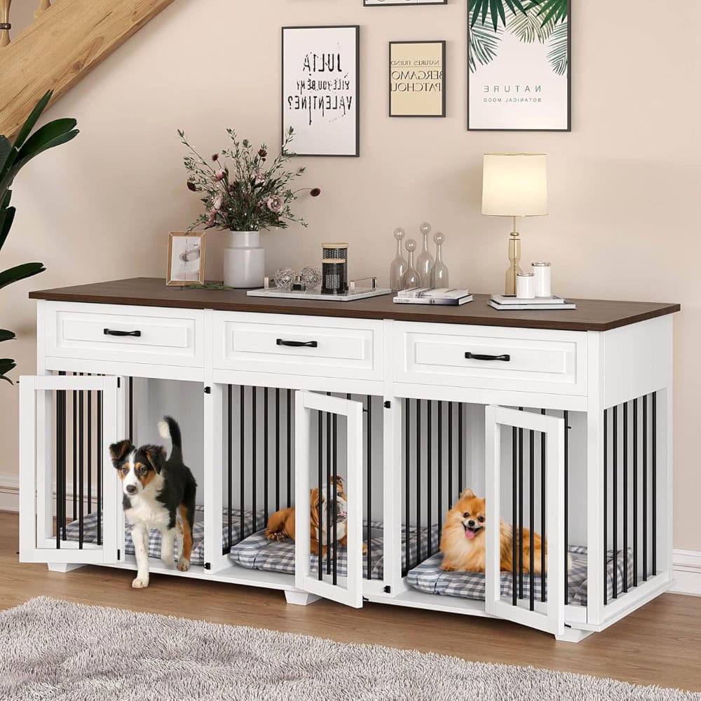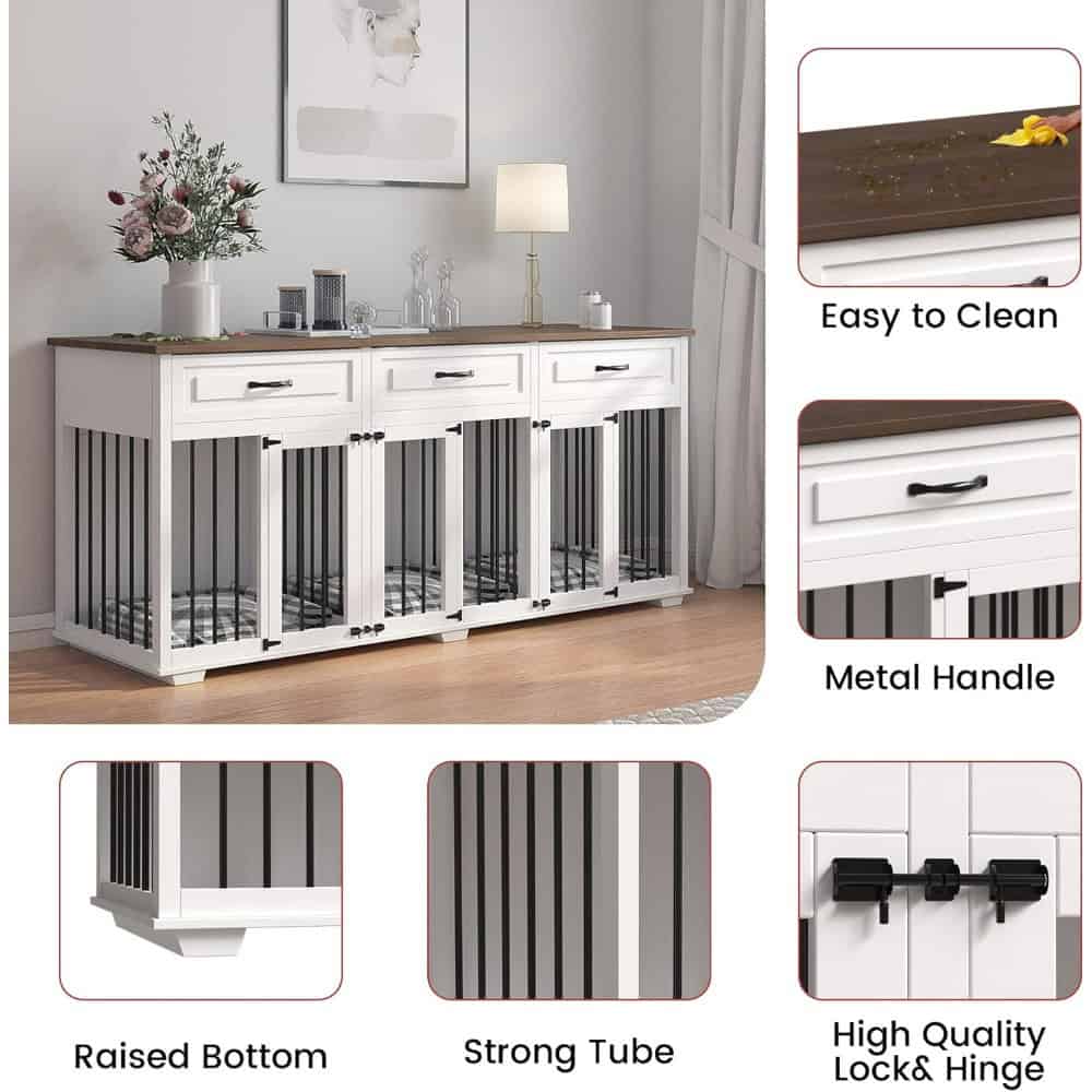 With spacious dimensions of 71″L x 23.6″W x 31.5″H, this crate offers plenty of room for your dogs to rest comfortably. The elevated feet keep the crate dry, reducing dampness, while the modern aesthetic adds sophistication to your home. The removable dividers make it adaptable to your pets’ needs, and the additional storage ensures a clutter-free environment.