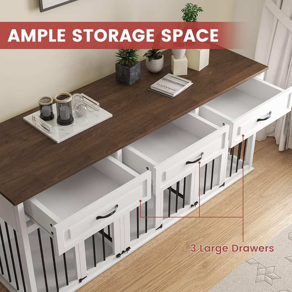 - Generous Storage: Three large drawers provide ample storage space for pet essentials like leashes, snacks, and grooming supplies, while the sturdy top can hold up to 100 lbs, perfect for decor or a TV.