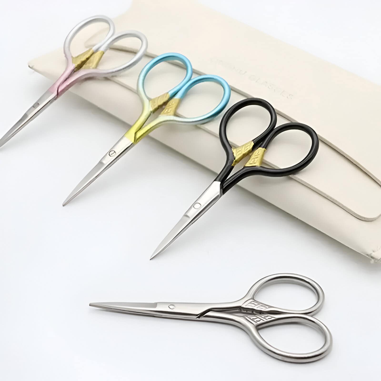 Color-coded surgical scissors for precise eye procedures, essential for ophthalmology and eye care professionals.