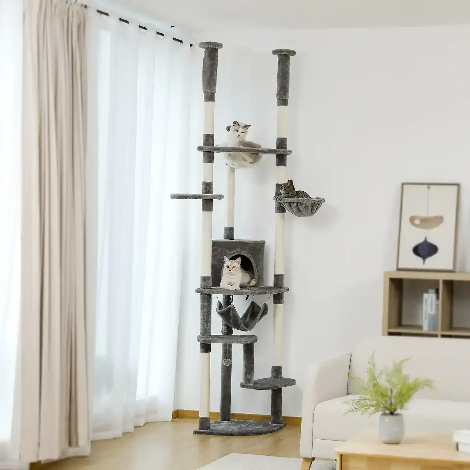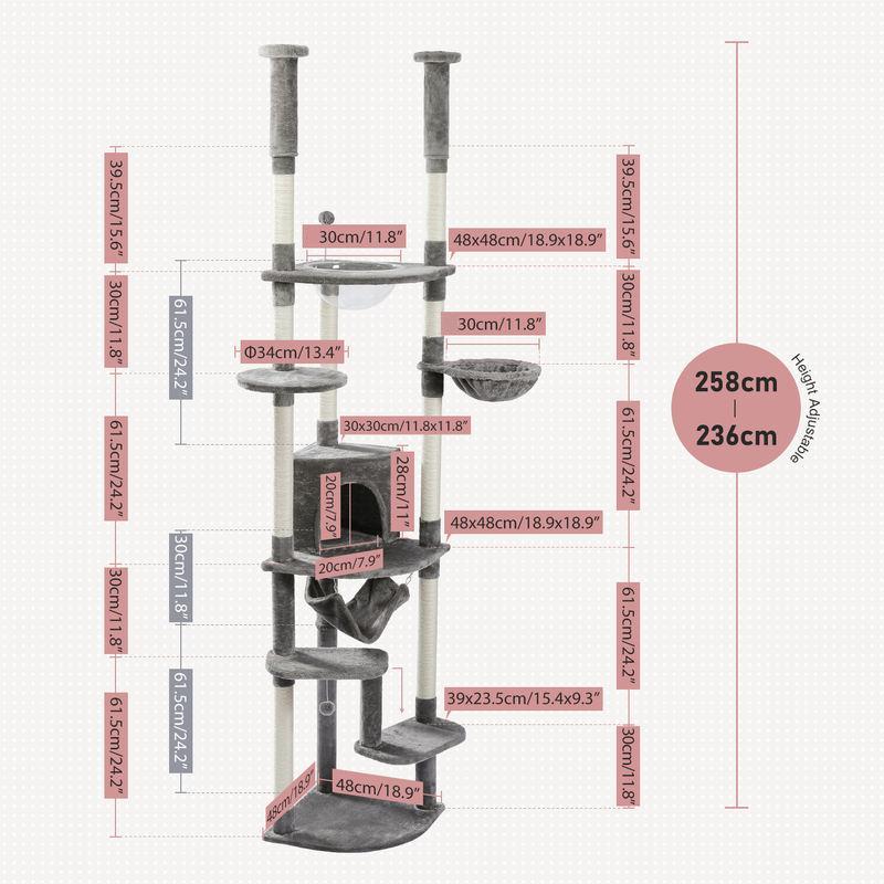 Give your feline friend a luxurious multi-level playground with the Adjustable Cat Tree Tower. Designed for indoor cats, this tower combines functionality, durability, and style to meet your pet’s every need. The height-adjustable structure, ranging from 92.9 inches to 101.6 inches, makes it adaptable to various ceiling heights, creating a tailored and engaging space for your cat.