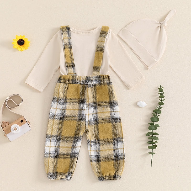 Get your little one ready for fall in this charming 3-piece outfit that’s both practical and stylish. The set includes a soft long-sleeve romper with a dashing bowtie, classic plaid suspender pants, and an adorable matching hat. Perfect for special occasions, photoshoots, or everyday wear, this outfit ensures your baby boy is always the center of attention.