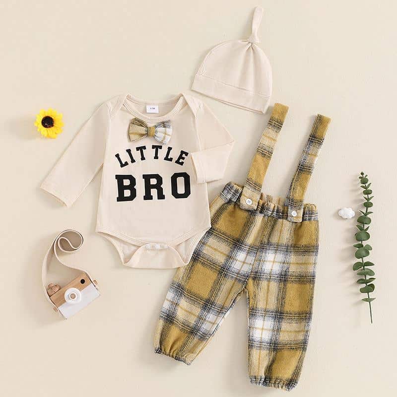 Cute baby clothing set with "Little Bro" graphic onesie, plaid suspenders pants, matching hat, and accessories for infant boys or girls. Perfect for toddler fashion and gift ideas.