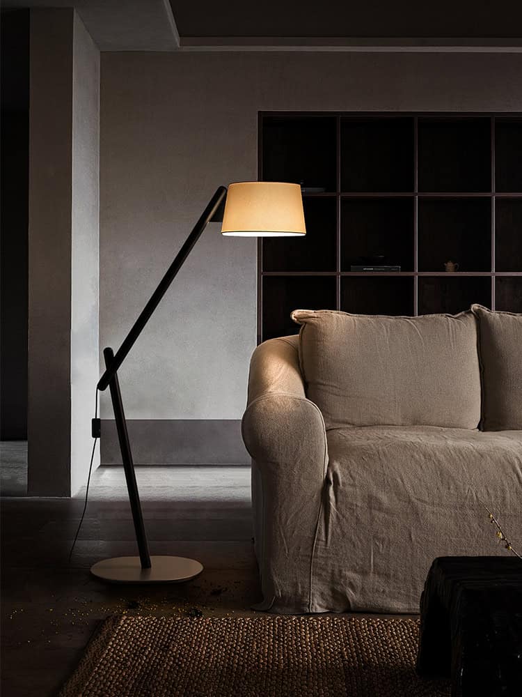 Contemporary floor lamp with adjustable arm and beige lampshade, modern interior design, warm lighting, stylish home decor, perfect for living rooms or reading areas.
