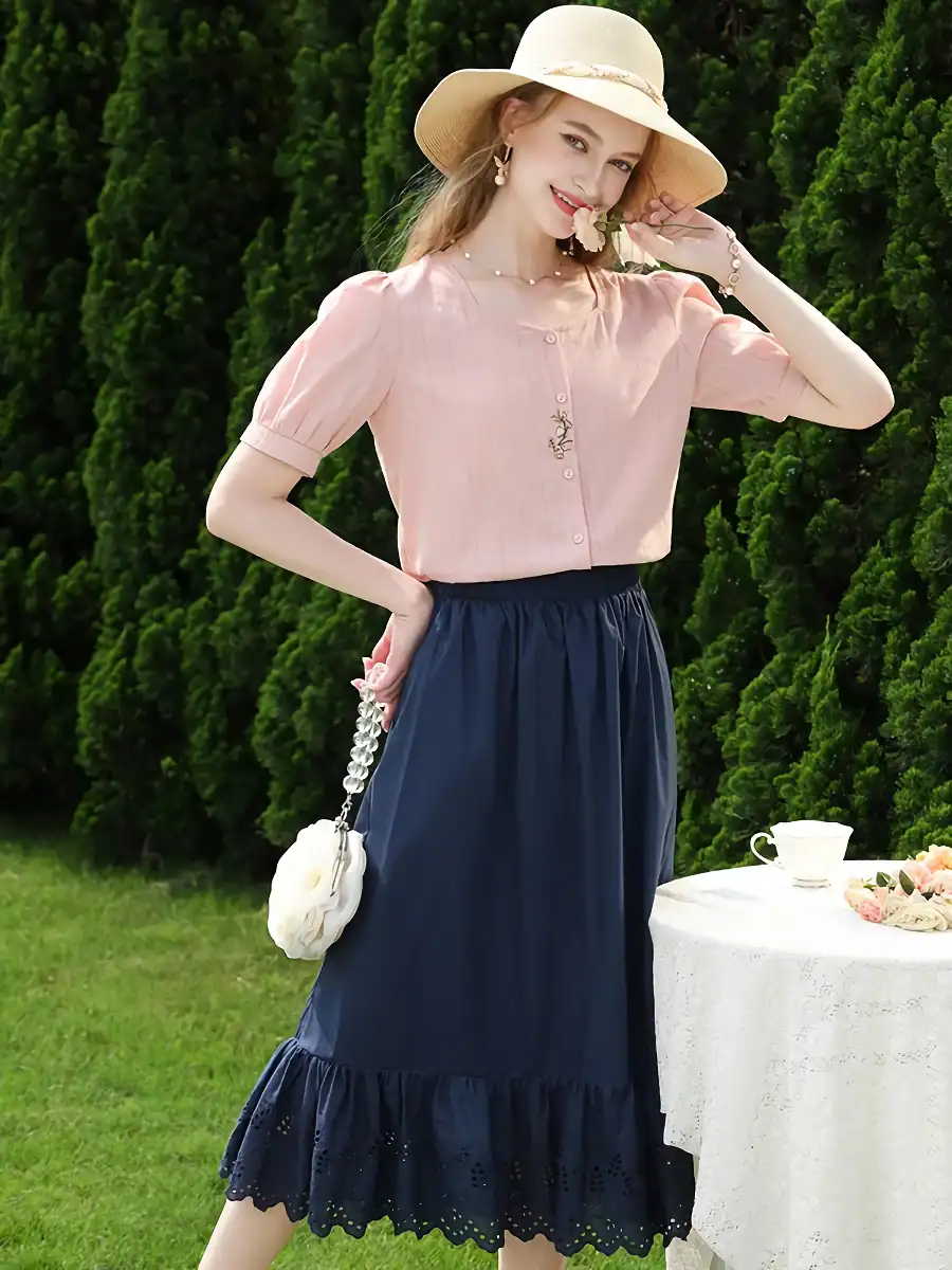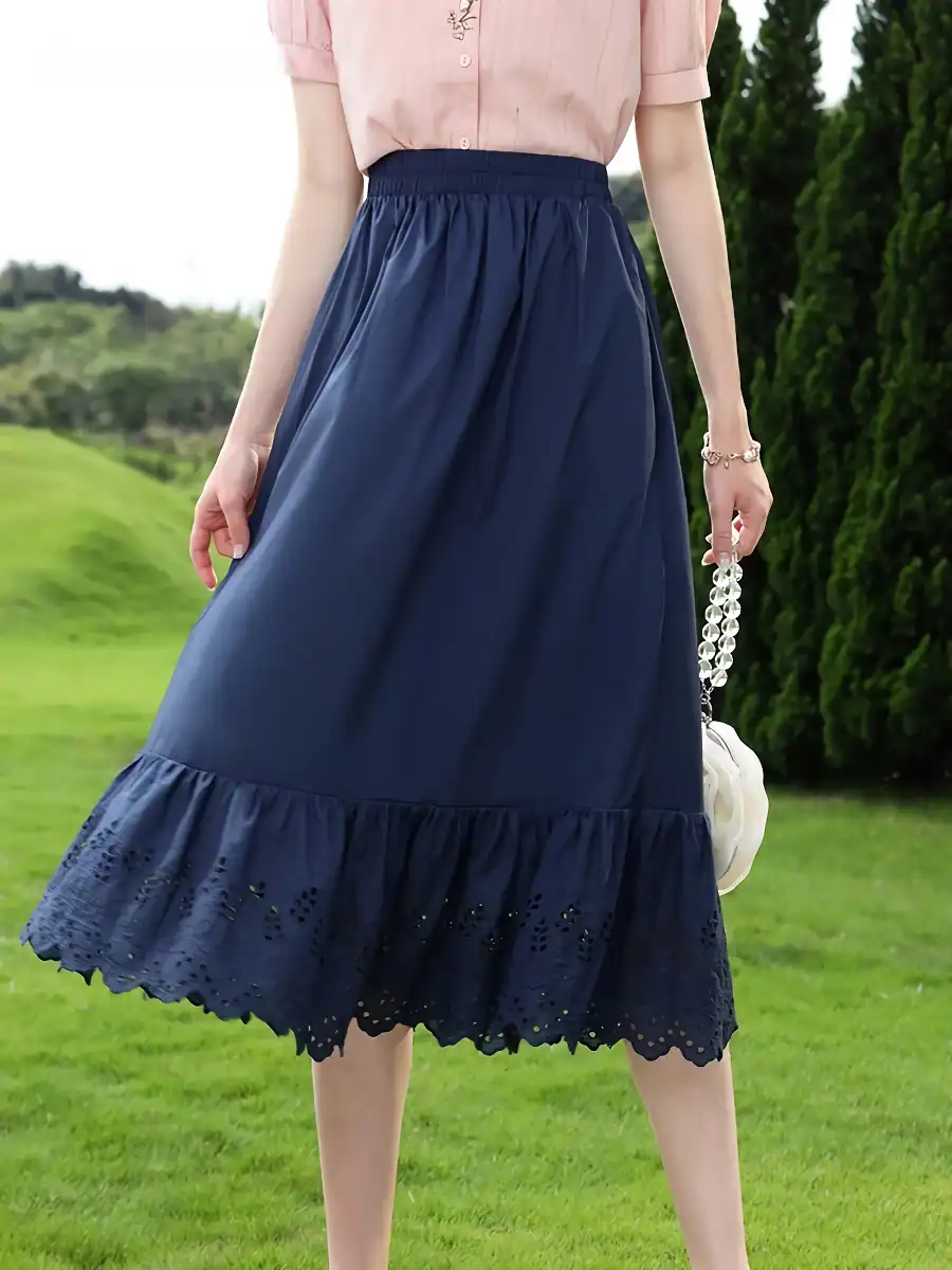 Indulge in the beauty of simplicity and sophistication with our Blue High Waist A-line Cotton Lace Patchwork Summer Skirt. Elevate your everyday look or dress it up for special occasions with ease.