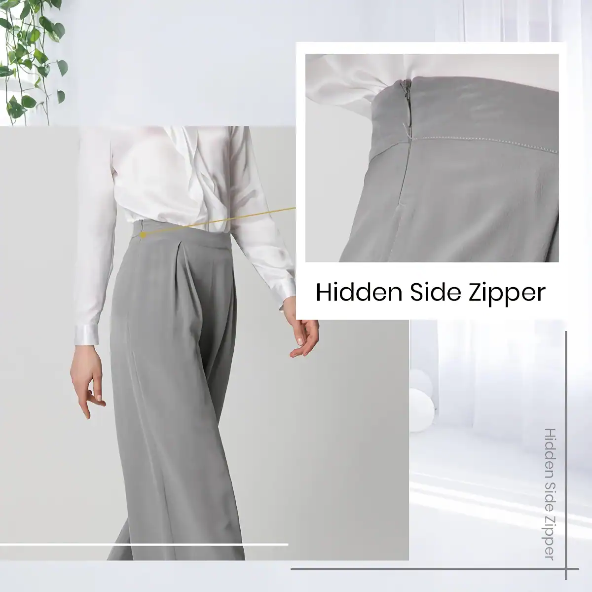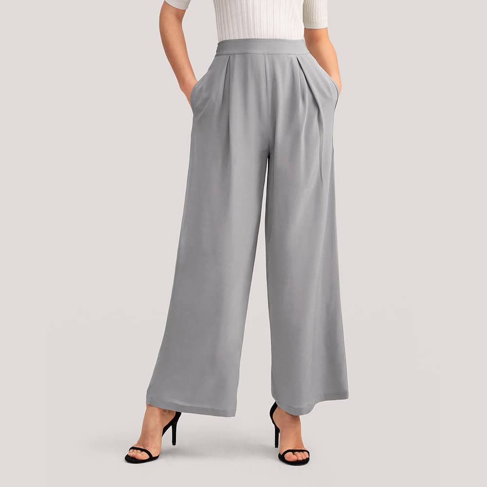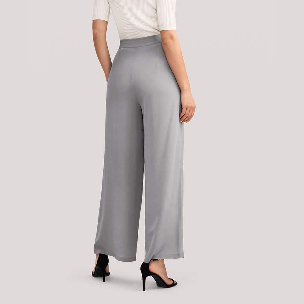 Transform your look and command attention wherever you go. Order now and experience the luxury of silk with our Chic Silk Wide Leg Pants in Classy Grey. Free shipping included for a limited time!