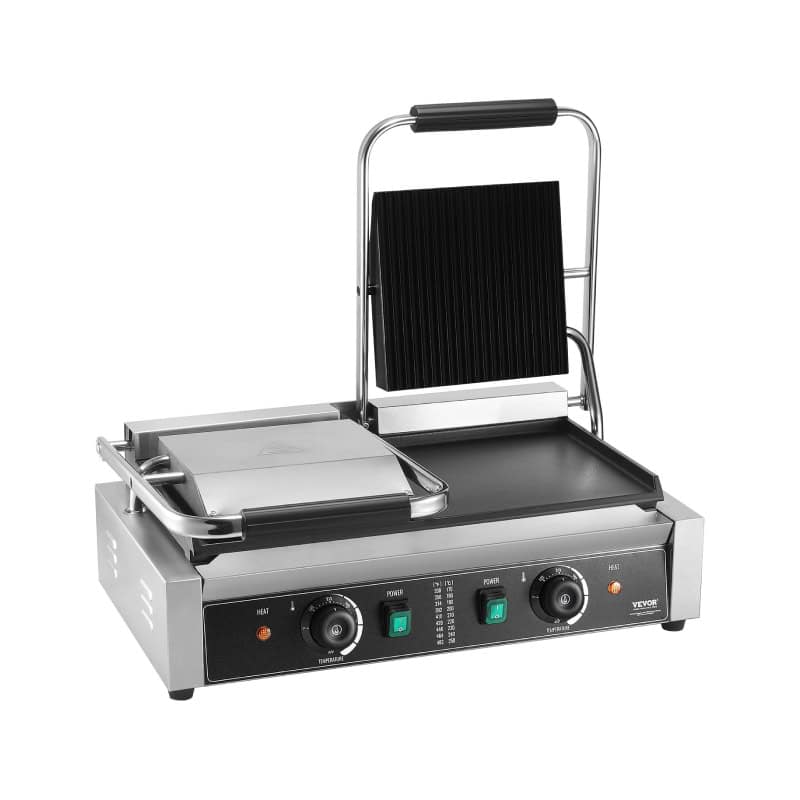 This panini grill stands out with its dual heating system that ensures consistent cooking across the entire surface. The enamel-coated grill plate is not only durable but also distributes heat evenly for flawless results. The adjustable temperature control allows you to prepare a wide range of foods, making it a versatile choice for both commercial and personal use. Plus, its compact design ensures it fits perfectly on any countertop without sacrificing cooking space.