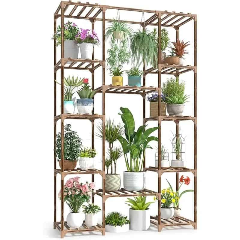 Our plant stand is a sanctuary for your plants, crafted from natural wood and designed to support a greener lifestyle. With 12 levels to display at least 12 plants, its compact footprint makes it a perfect addition to any corner of your home or outdoor space. The unique staggered design ensures each plant receives ample sunlight and air, promoting healthier growth.