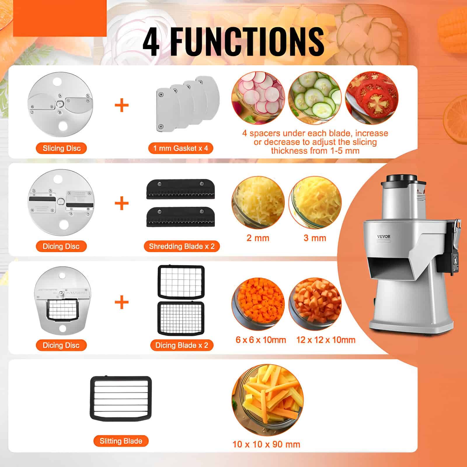 - 4-in-1 Functionality: Four sharp stainless steel blades enable slicing, shredding, dicing, and julienning, with adjustable thickness options ranging from 1-5 mm for slicing and 6 mm or 12 mm for dicing.