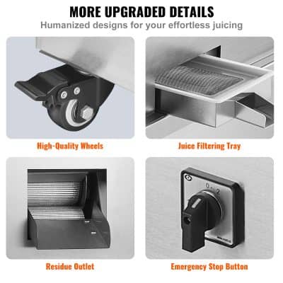- Portable and Versatile: With four sturdy wheels, this juicer is easy to move, making it ideal for various settings like beverage shops, outdoor stalls, or even your backyard.