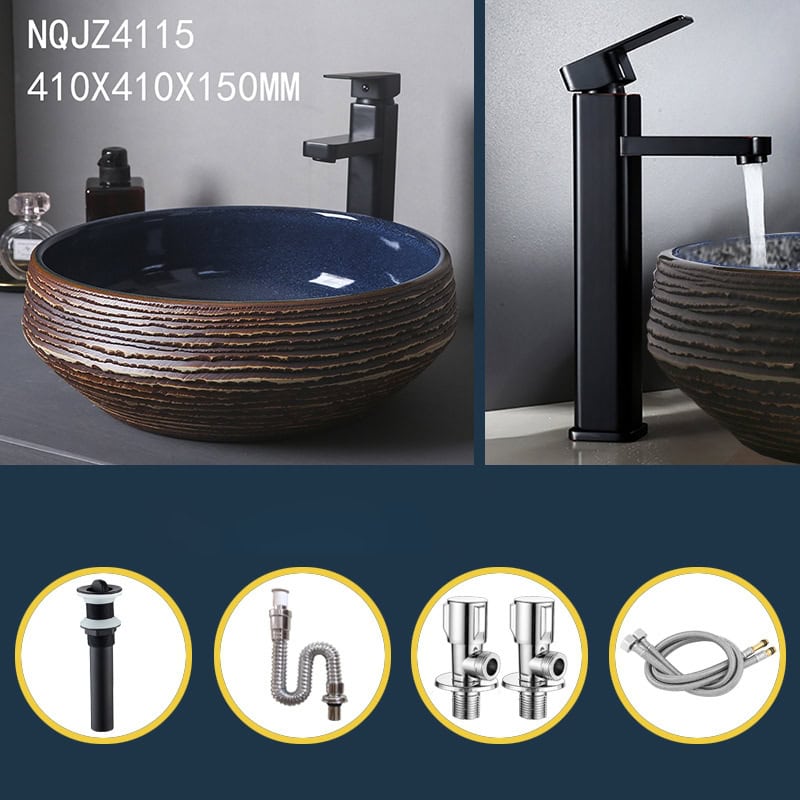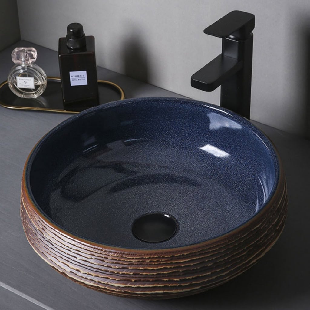 Upgrade your bathroom or balcony space with this exquisite round ceramic vessel sink. The stunning combination of navy blue and brown, along with a carved texture, makes this sink a striking centerpiece for any modern or rustic interior. Perfectly designed for above-counter installation, this art basin is as functional as it is beautiful, blending practicality with a touch of sophistication.