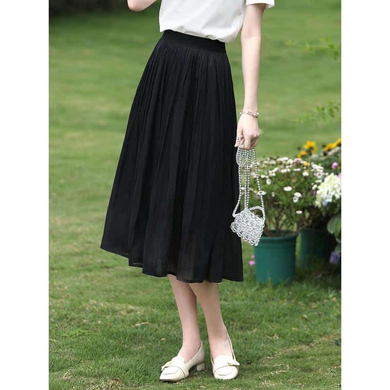 Our Satin Pleated Midi Skirt shines with its simplicity and elegance. The broadcloth fabric offers a flowy feel while maintaining its shape, perfect for warmer days or sophisticated evenings out. The non-stretch fabric ensures the skirt keeps its shape, enhancing its durability and wearability over time. Ideal for middle-aged women, this skirt complements various body types with its loose fit and natural waistline.