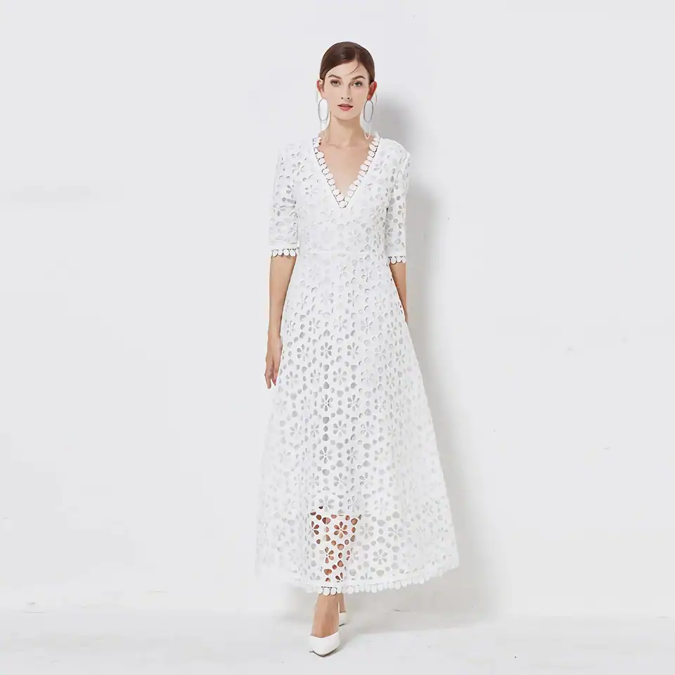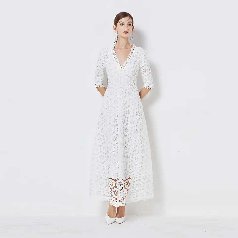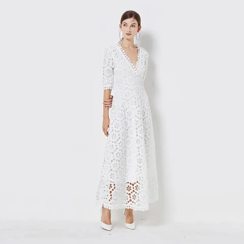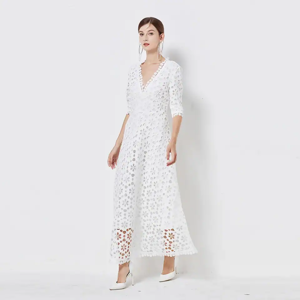 Step into the room with confidence and grace in our Elegant V-Neck Lace Maxi Dress. Perfect for evening parties or any special occasion, this dress combines a sophisticated silhouette with a touch of high-street fashion. Designed for women who cherish both style and comfort, this white lace dress is a timeless addition to your wardrobe.