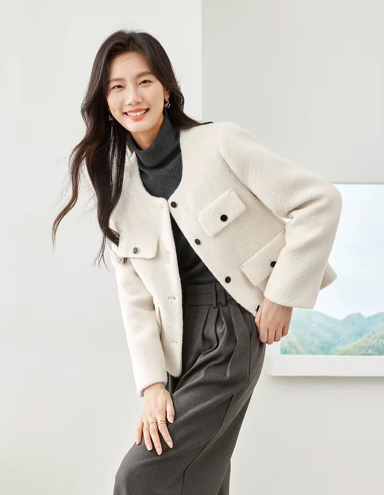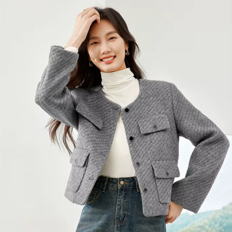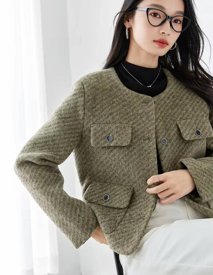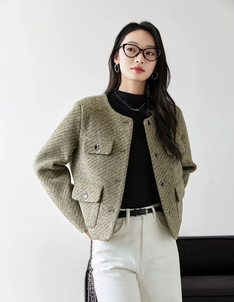 Step into effortless sophistication with this elegant women’s woolen cropped jacket. Designed for the modern office lady, this short blazer exudes charm and professionalism. Its cropped length and tailored fit add a contemporary touch, making it perfect for creating stylish workwear looks or chic casual ensembles. Crafted from a premium blend of polyester, nylon, acrylic, and viscose, this jacket offers warmth and comfort while maintaining a lightweight, polished silhouette.