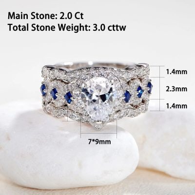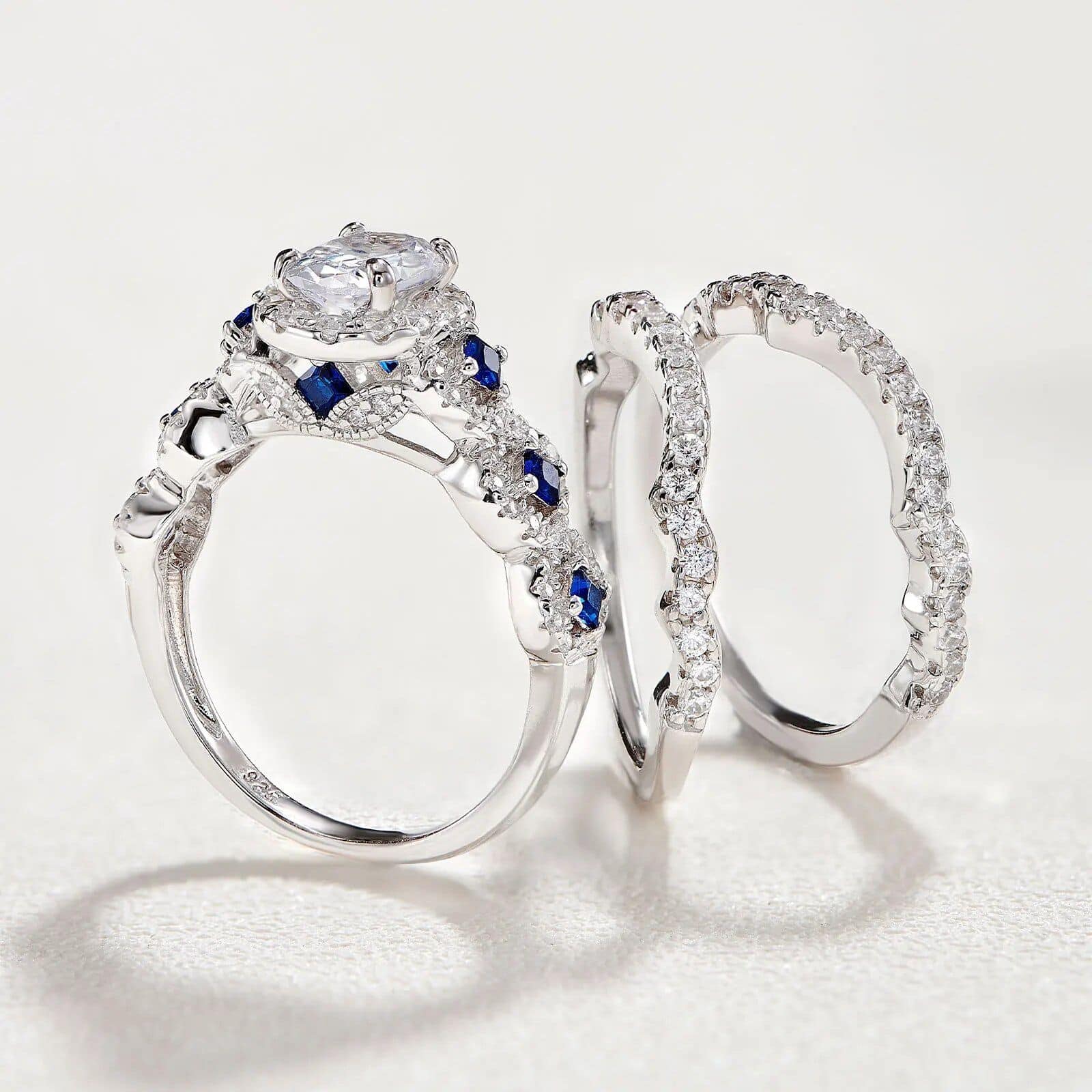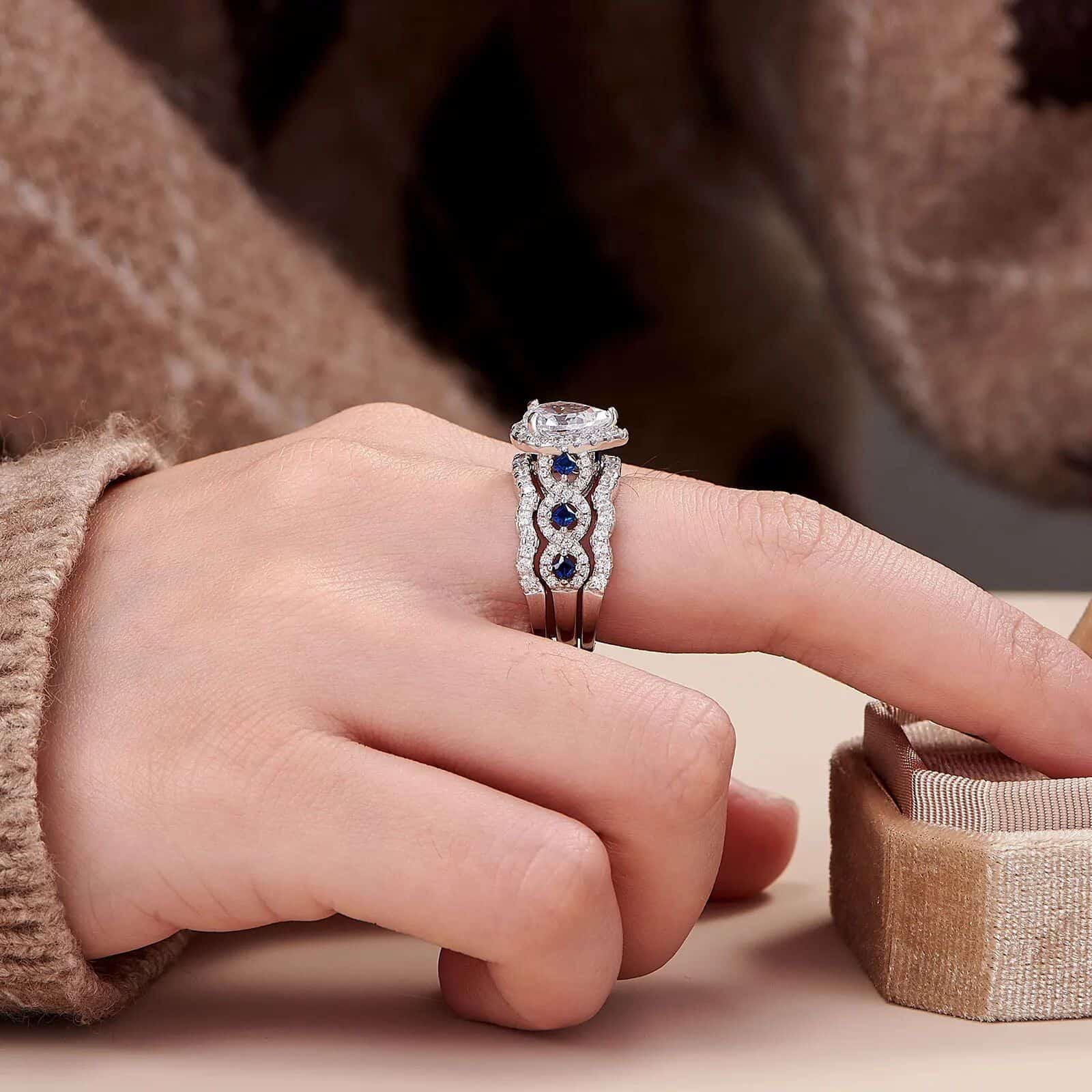 Each ring in this set is meticulously designed with 75 AAAAA cubic zirconia stones, totaling 3.0 CTTW. The smooth prong setting keeps the main stones secure and comfortable, ensuring a stunning yet easy-to-wear experience. The rings feature an additional touch of luxury with 8 small AAAAA blue sapphire gemstones, adding a pop of color and uniqueness to the set.