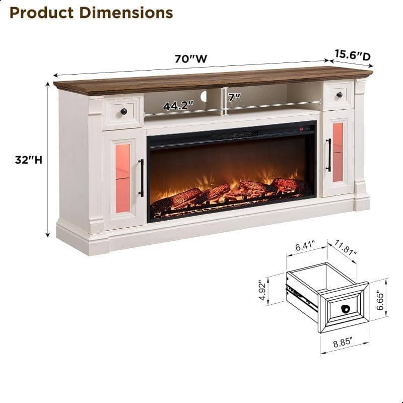 Elevate your home entertainment experience with this stunning farmhouse-style fireplace TV stand. Designed for TVs up to 80 inches, this centerpiece blends rustic charm with modern functionality. Its distressed antique white finish, sturdy construction, and weathered oak accents make it a perfect addition to any living room, family room, or den. With its commanding presence and cozy appeal, this stand brings warmth and character to your home.