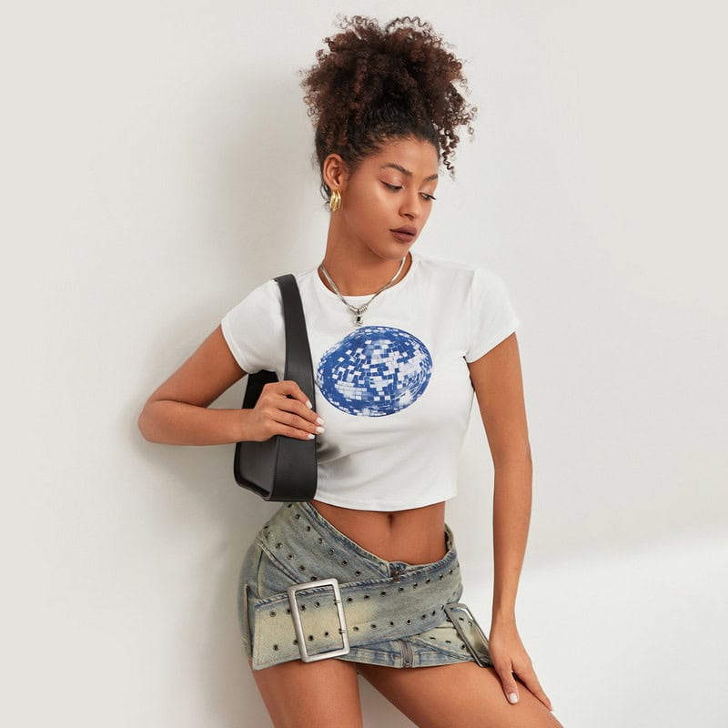 Stylish white crop top with blue disco mirror design, perfect for trendy fashion statements and casual outings.