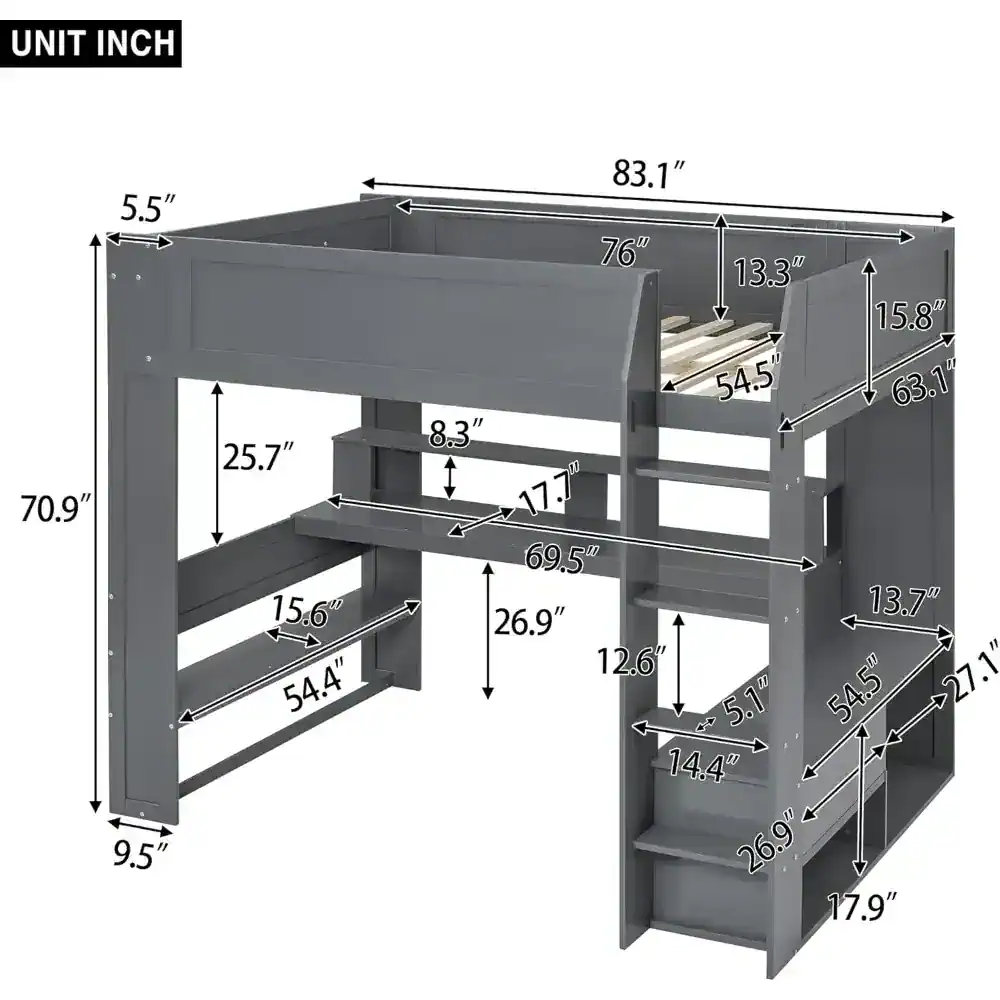 • Safety First: The high loft bed comes equipped with a secure guardrail and an integrated ladder for easy access, offering peace of mind and safety.