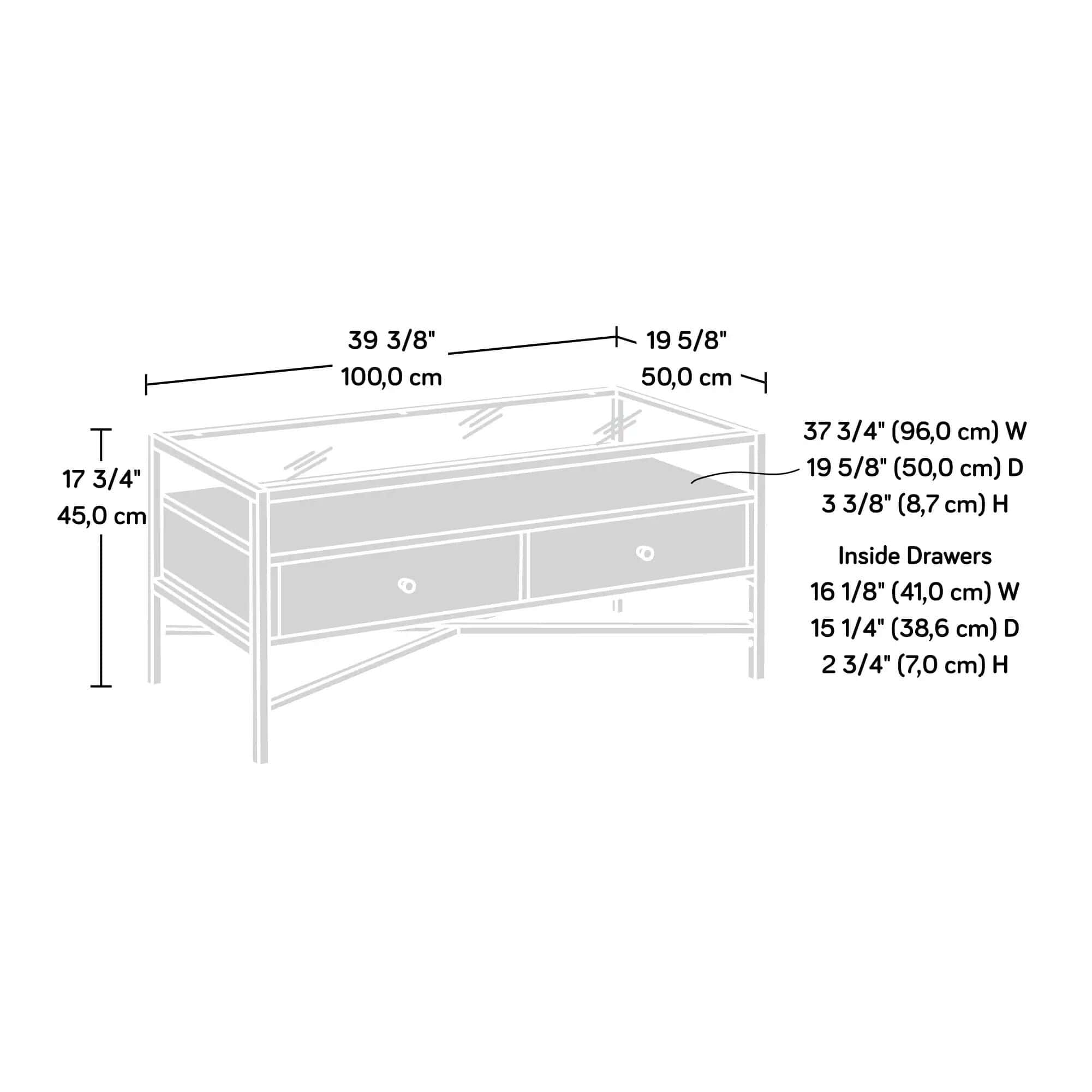 Elegant coffee table with gold frame and dark wood drawers for stylish living room decor. Ideal for showcasing decor, storing essentials, and enhancing your space with contemporary design.