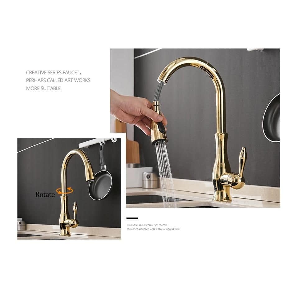 Our Gold Pull Out Kitchen Faucet is best utilized in modern kitchens where both style and functionality are prioritized. Whether you are renovating your kitchen or simply upgrading your kitchen fixtures, this faucet provides the perfect balance of modern elegance and practical utility. Its single hole installation and retractable spout make it a versatile choice for any kitchen layout, ensuring a seamless fit with your current sink setup.