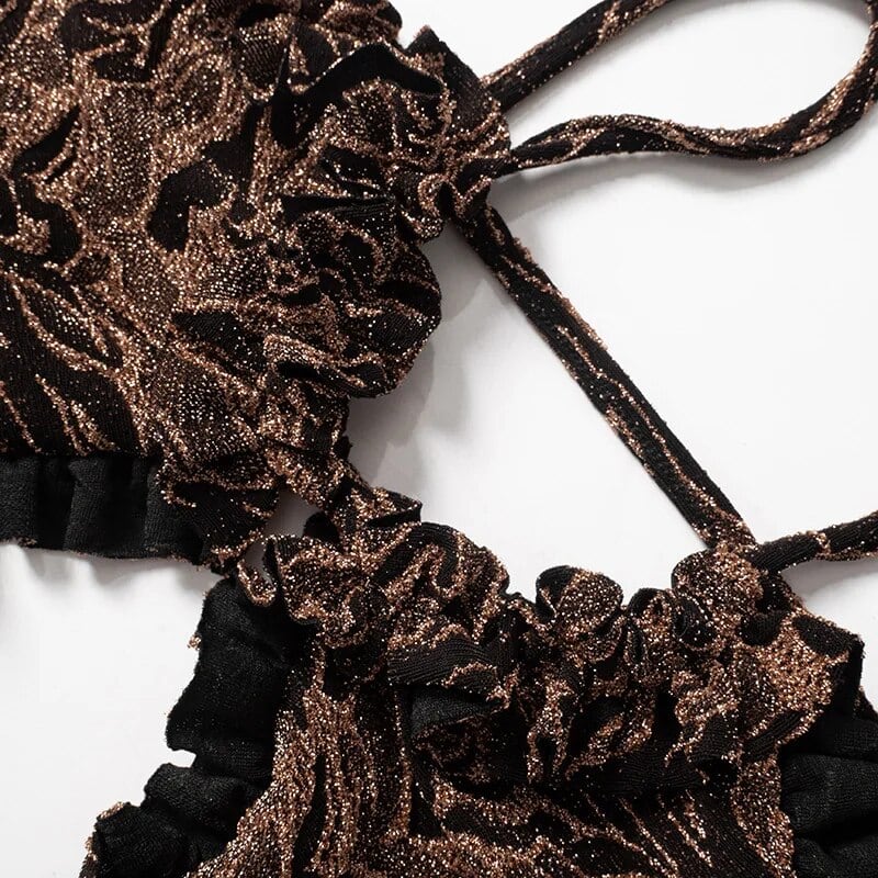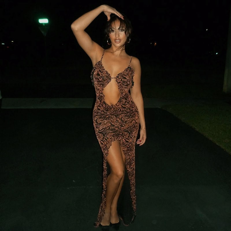With delicate spaghetti straps and a mesmerizing backless, strapless silhouette, this dress exudes femininity and charm. The high split adds a touch of allure, while the intricate jacquard ruffles create a stunning visual appeal.