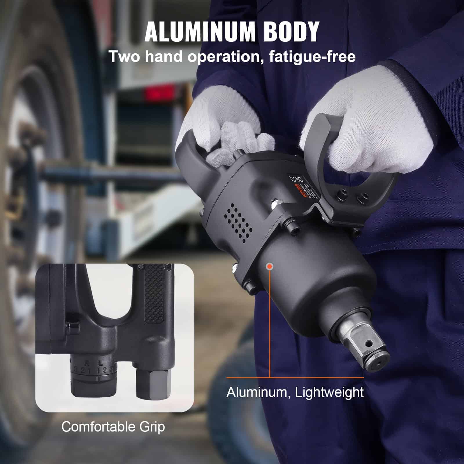 • Lightweight and Ergonomic Design – Weighing just 17 lbs, this impact wrench reduces user fatigue, and the two D-shaped handles enhance control for precise, comfortable handling.