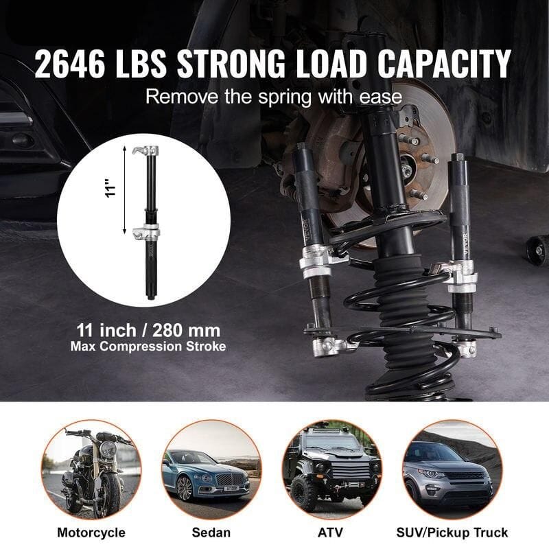 Introducing our premium Coil Spring Compressor Tool, a must-have for mechanics and DIY enthusiasts alike. Boasting an impressive load-bearing capacity of 2646 lbs, this tool is perfect for a wide range of vehicles, including motorcycles, cars, ATVs, pickups, and SUVs. Whether you’re tackling routine maintenance or complex repairs, this robust tool guarantees reliable and efficient performance.