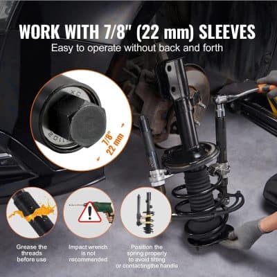 This tool stands out for its versatility, safety, and ease of use. Its adjustable safety brackets and secure locking ring provide a stable and safe compression process, reducing the risk of spring rebound. The high-hardness steel construction ensures longevity, resisting corrosion and rust, even under harsh conditions. Its compatibility with a standard 3/4″ socket makes it a handy addition to any toolkit.