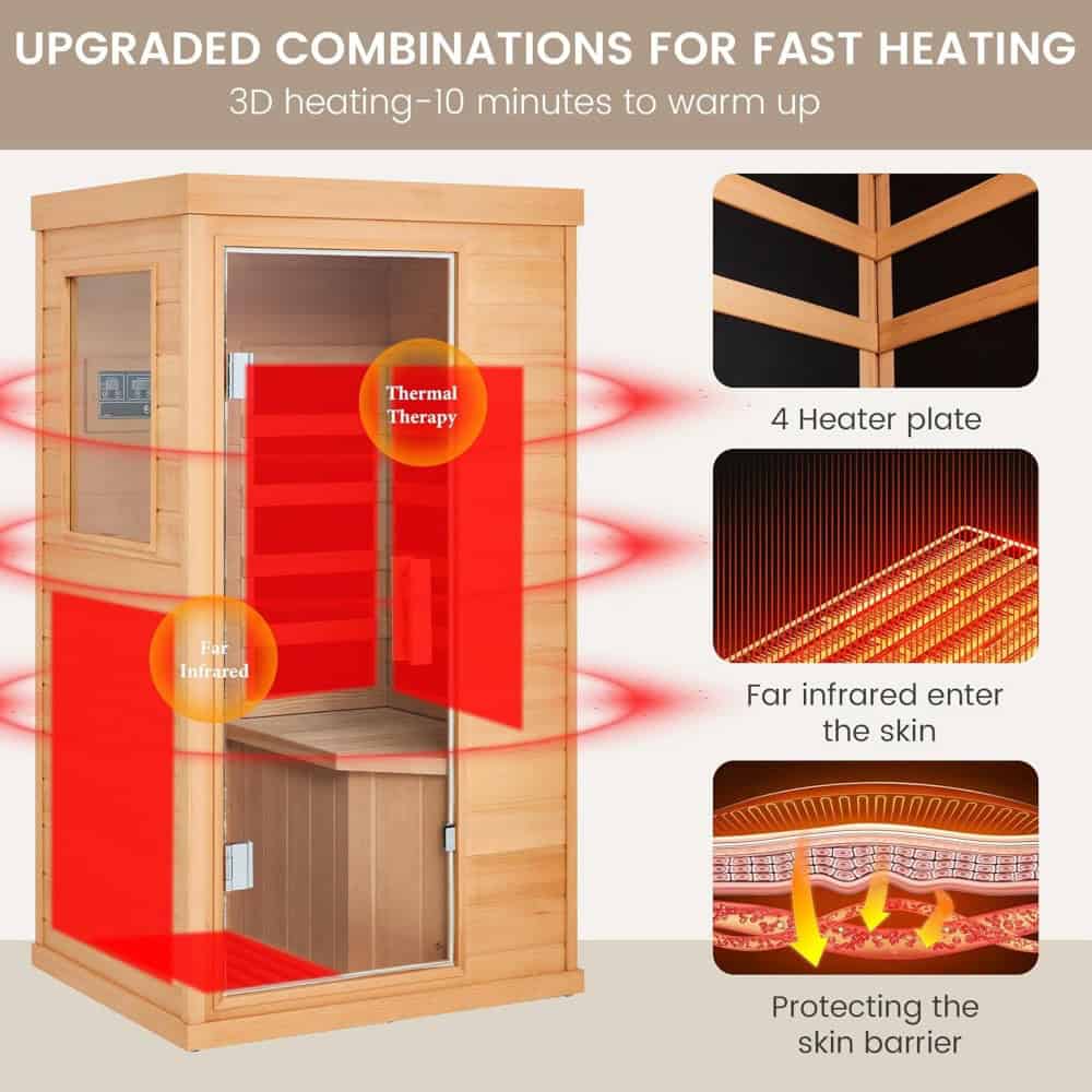 - Full-Spectrum Infrared Heating: Equipped with 4 mica carbon heaters, the sauna provides 360° surround heating for even warmth in as little as 10-15 minutes.