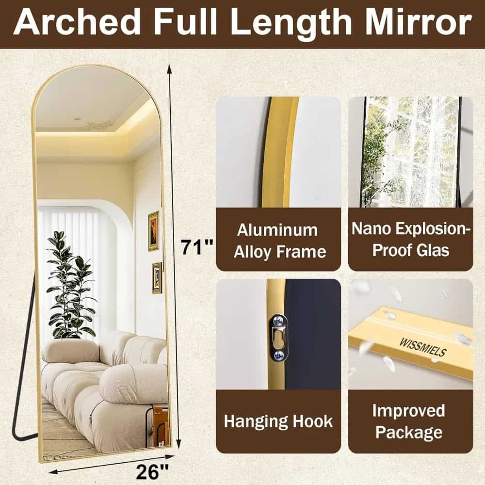 Transform your living room, bedroom, or bathroom with this large arched floor mirror. Standing at 71 inches tall and 26 inches wide, this full-length mirror allows you to see your entire outfit from head to toe. Its sleek and elegant design fits perfectly in any home, adding both style and functionality to your decor. Whether you’re getting ready in the morning or adding a statement piece to your interior, this mirror is a stunning addition that catches the eye.