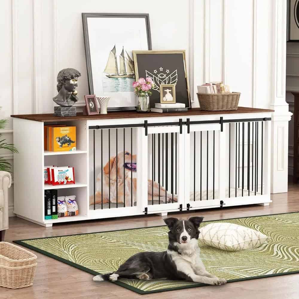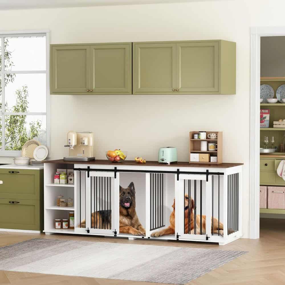 Large Wooden Dog Crate Furniture, 86.6″ Kennel with Shelves, Divider & Sliding Door