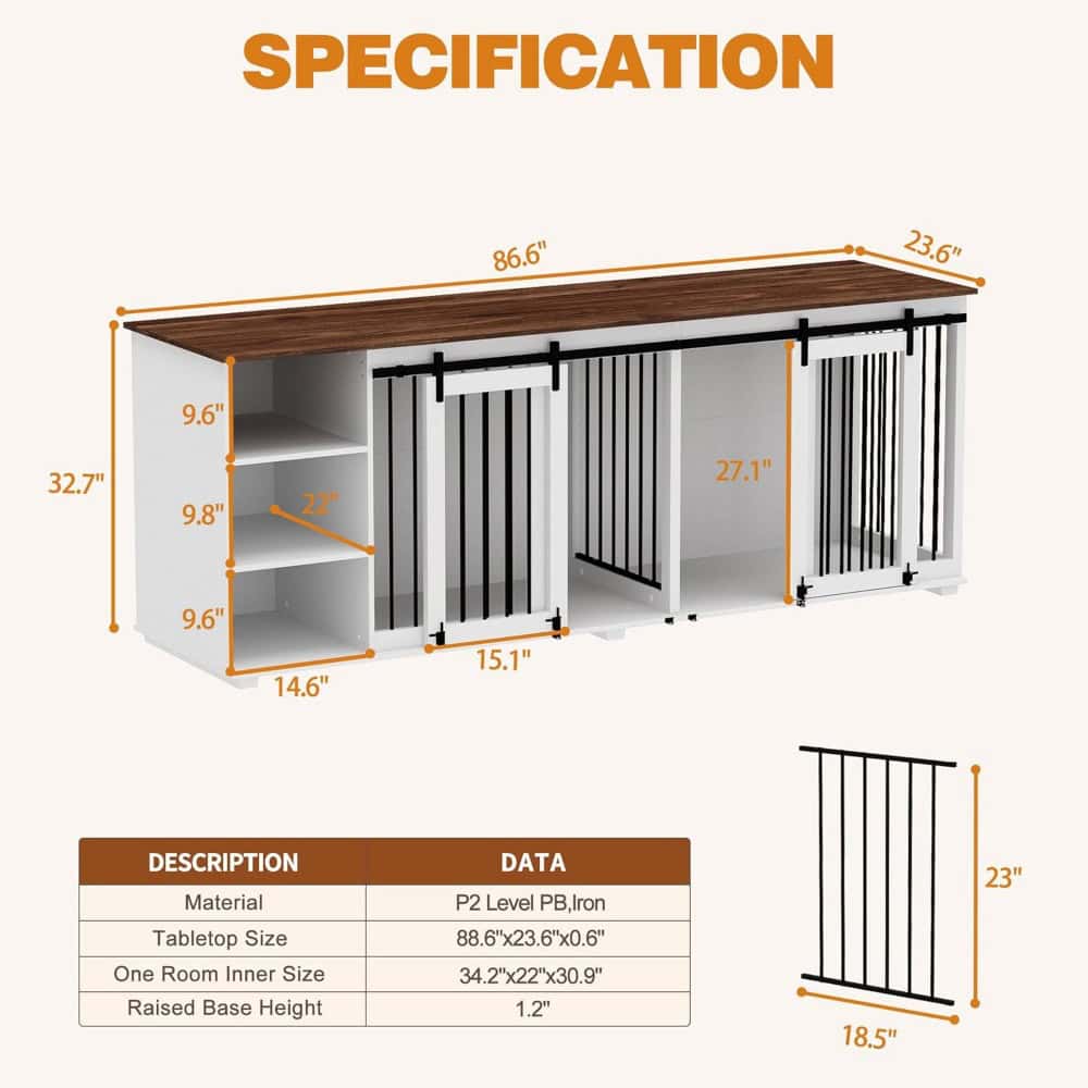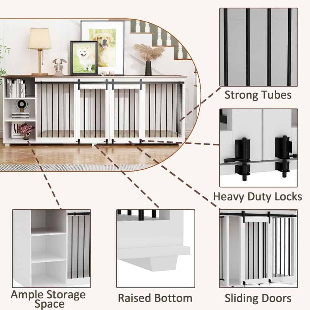 Upgrade your pet’s living space with this beautifully crafted 86.6″ wooden dog crate furniture. Combining modern style with practical functionality, this kennel offers a secure, spacious shelter for your pets while enhancing the aesthetics of your home. Designed with durable materials and thoughtful features, it serves as a versatile piece of furniture that doubles as a TV stand, sideboard, or storage unit.