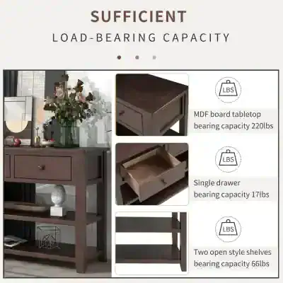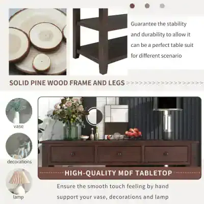 Bring style and functionality to your home with this long console table featuring three storage drawers and double bottom open shelves. Perfect for entryways, hallways, or foyers, this wooden sofa table blends classic design with modern practicality. Its durable pine wood frame and smooth MDF tabletop make it an ideal addition to any home, offering a beautiful surface for décor and ample storage for everyday essentials.