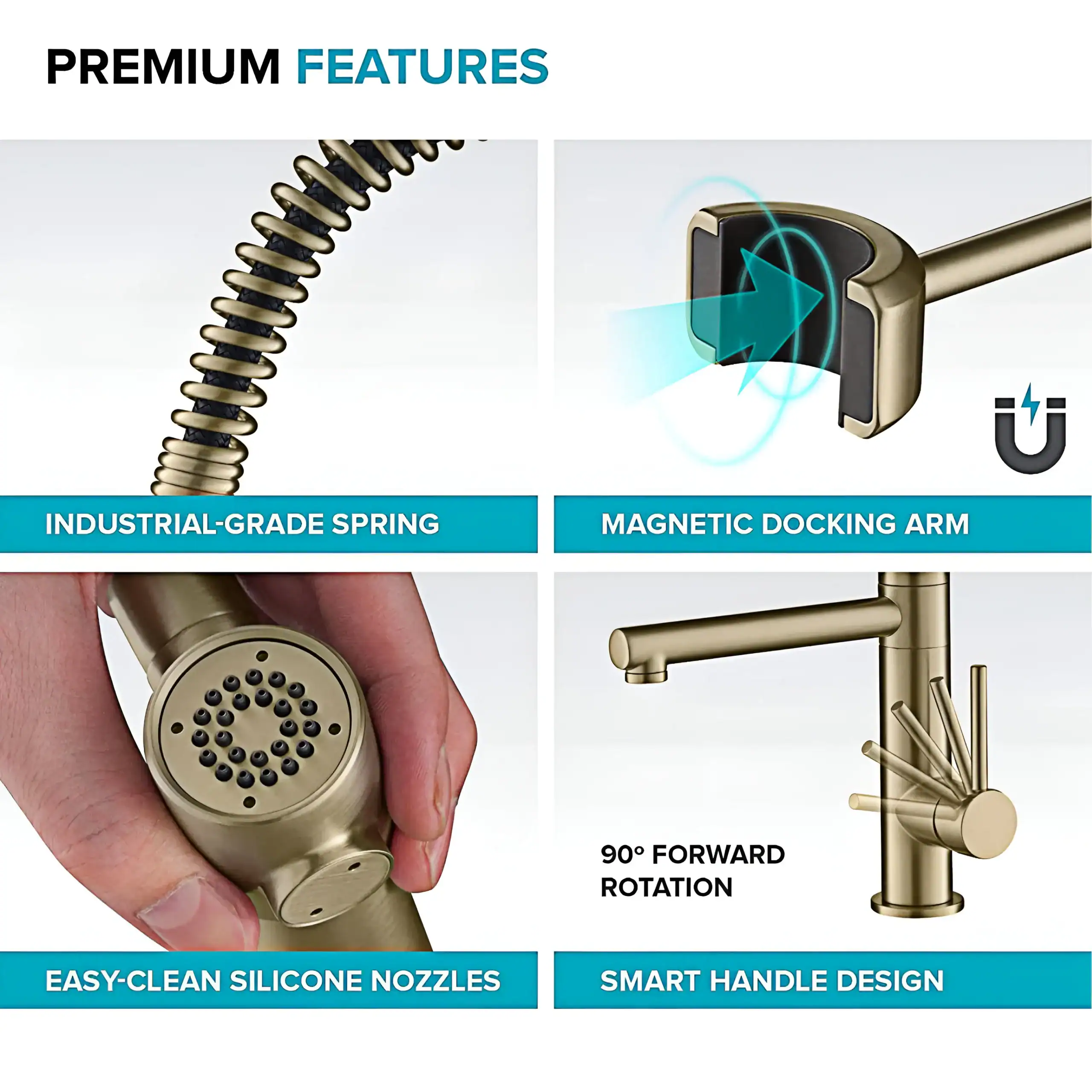 Luxury Brass Kitchen Faucet with Magnetic Suction and Dual-Control, Retractable Spout